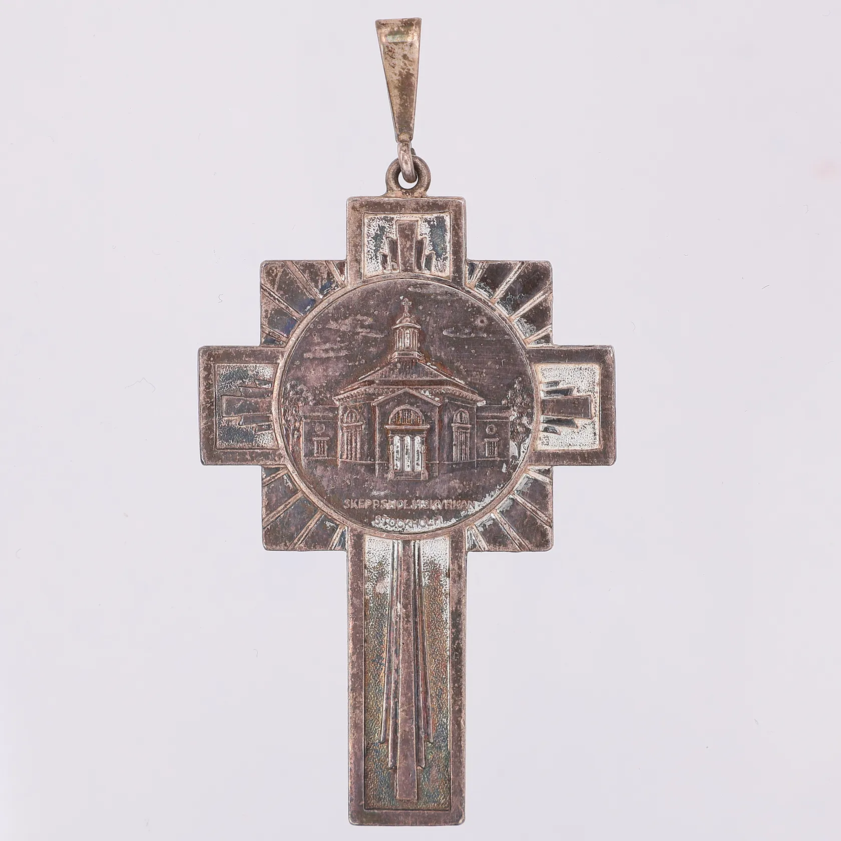 Hänge kors Skeppsholmskyrkan Stockholm 65mm, 33mm, Metallfabriks A/B C C Sporrong, kattfot 830/1000 silver Vikt: 14,8 g.