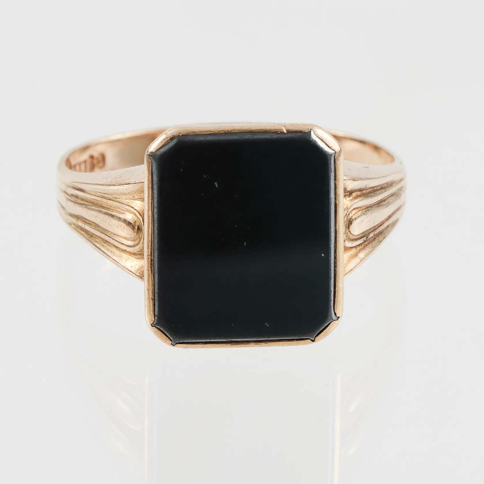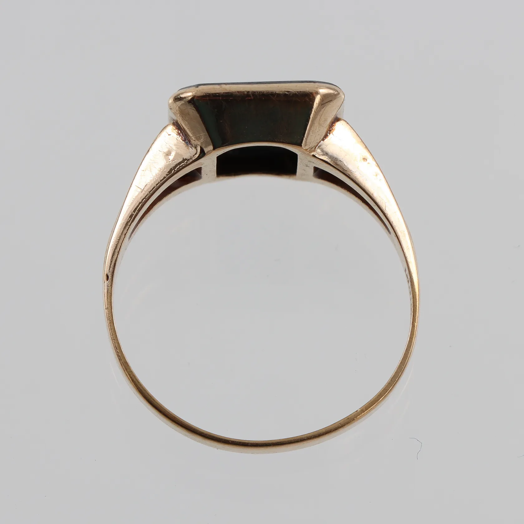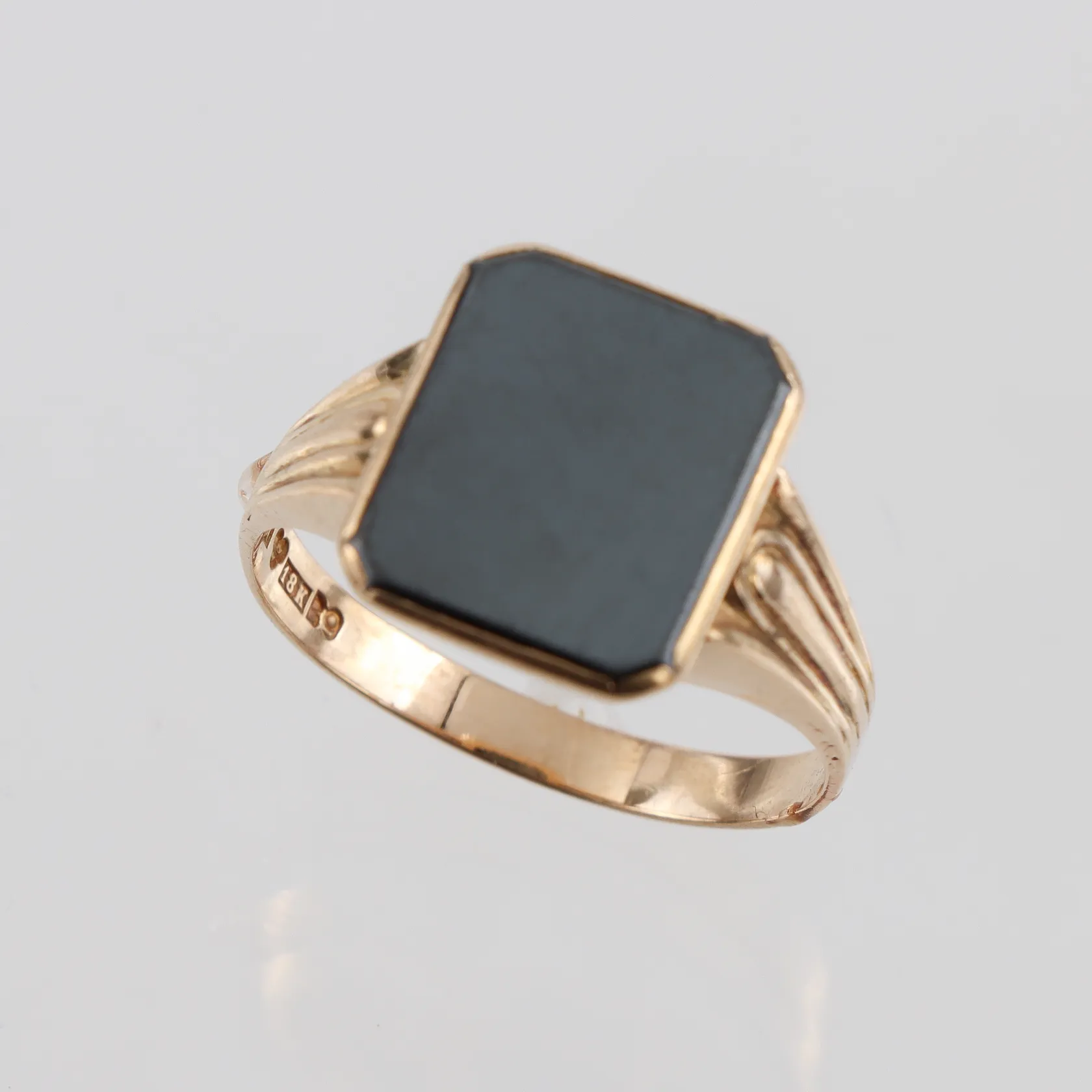 Klackring18k med sten troligtvis hematit, stl 20½mm, bredd 2,9-14,6mm, Hallbergs Guldvarufabrik Hovjuv B Köping 1952, något ojämn form Vikt: 5,8 g.