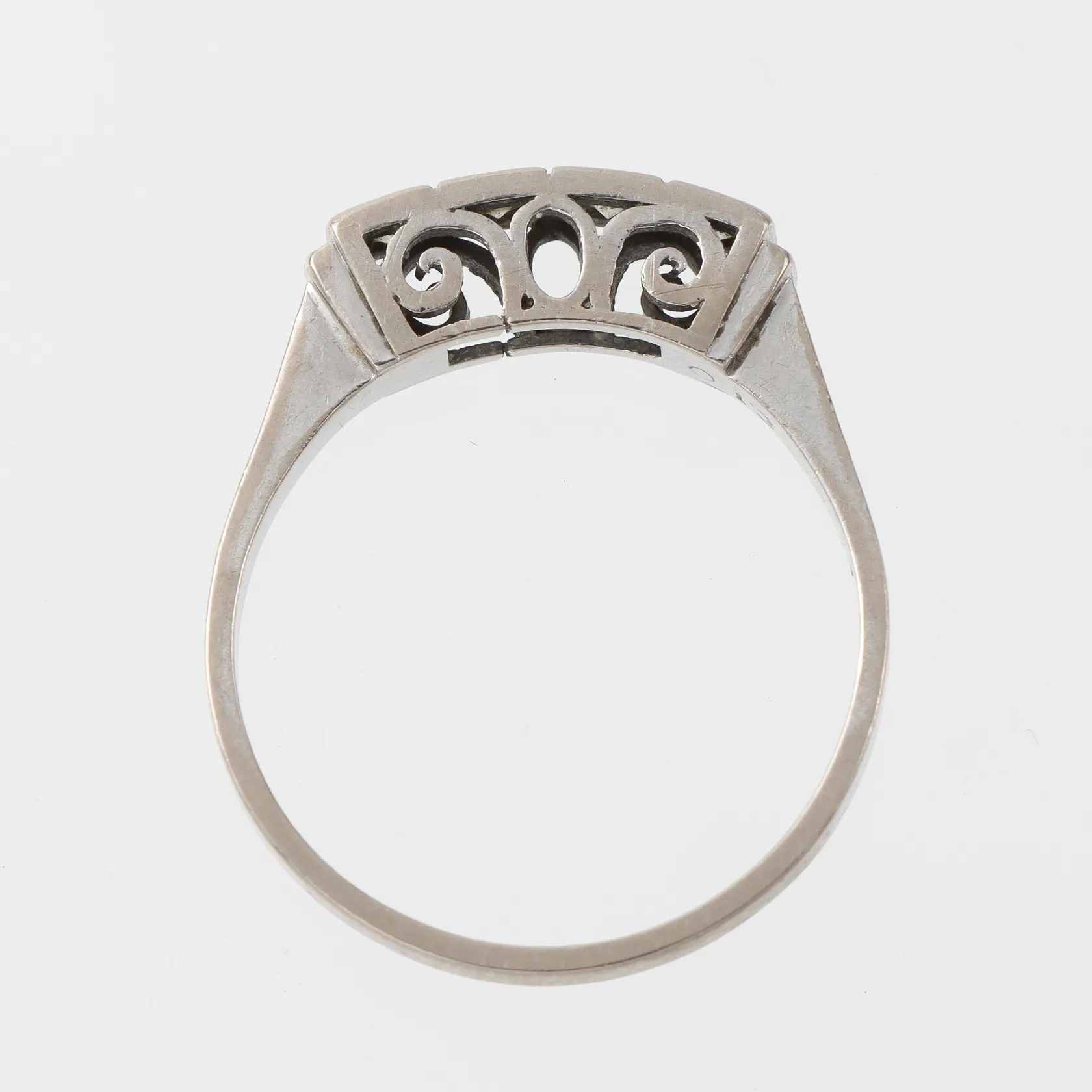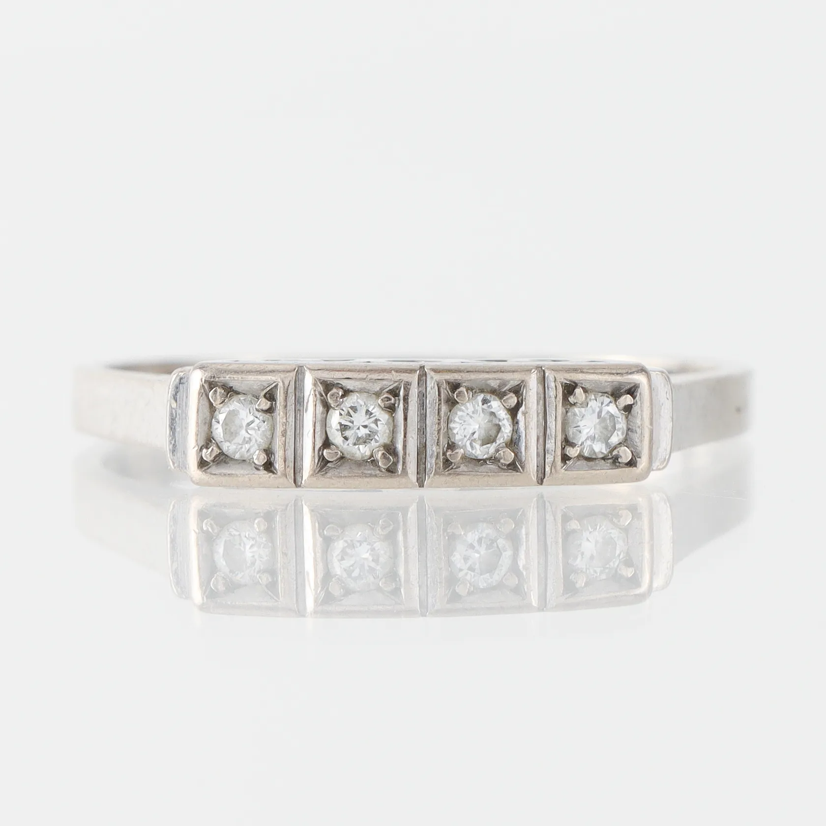 Diamantring 18k vitguld med 4 st diamanter på totalt 0.13 ct, Juvelateljen Evert Lindberg AB Göteborg 1980, storlek 20 mm, bredd 1.7-3.8 mm Vikt: 4,6 g.