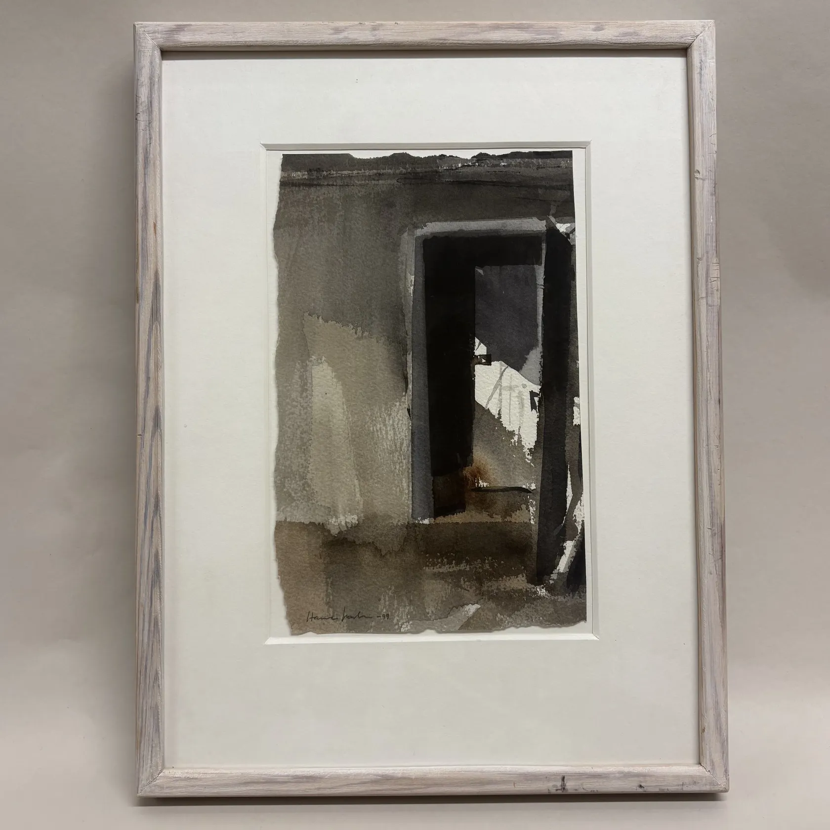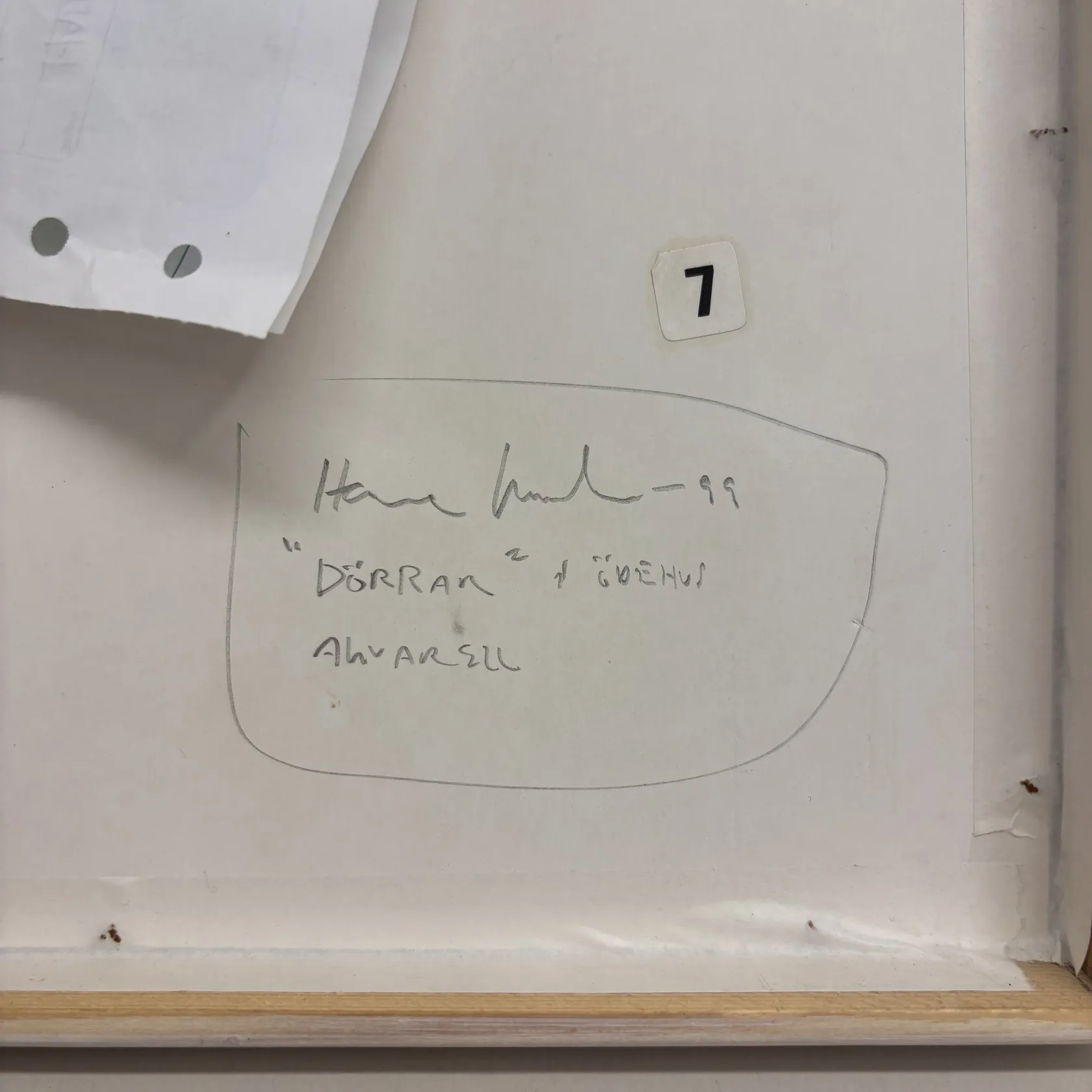 Tavla Dörrar i ödehus, akvarell, signerad Hasse Karlsson (1952-) 1999, bildmått ca26x17cm, inramad med glas, slitage på ram. Skickas med postpaket.
