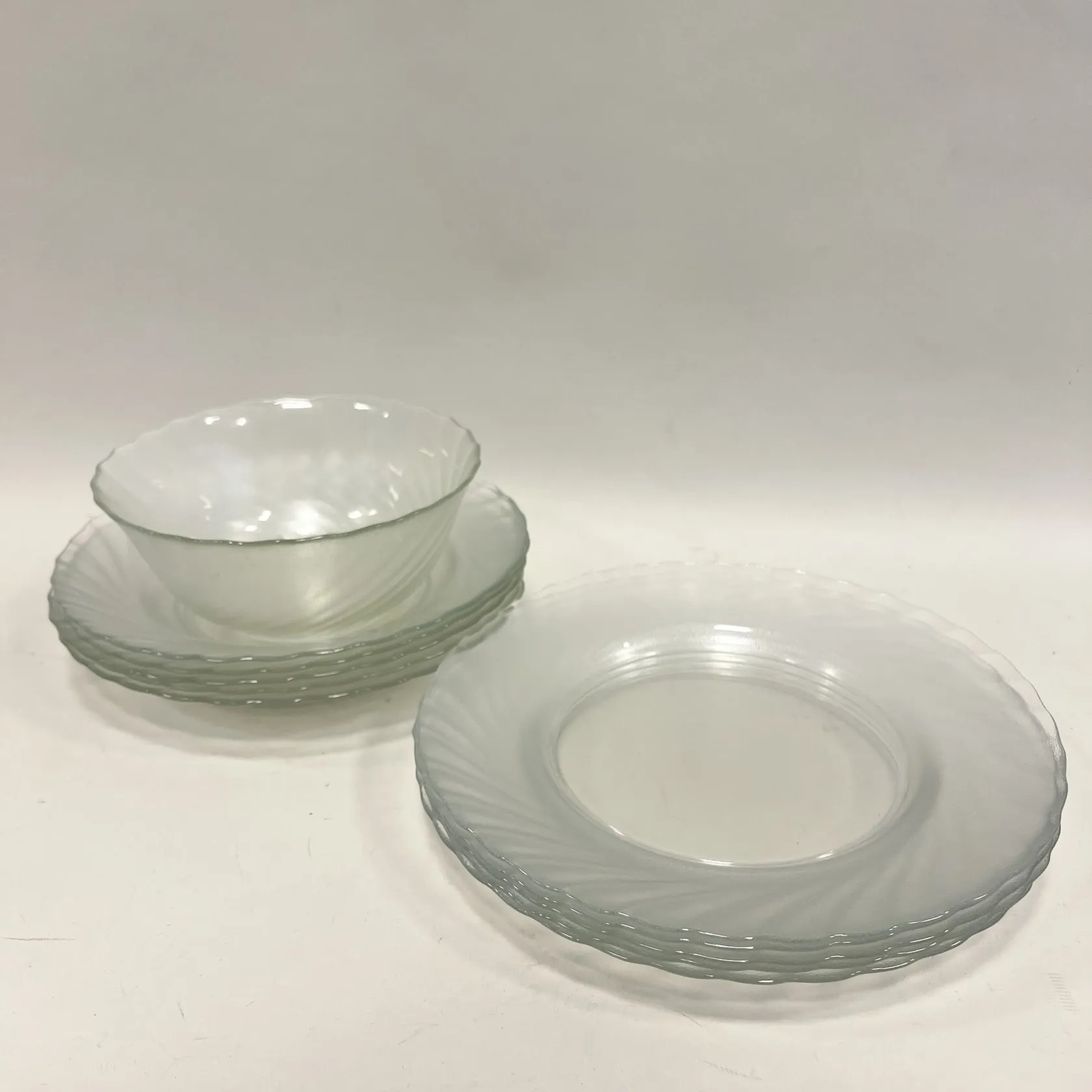 Servisdelar, Arcoroc, ur serien Clearbrook Swirl, 1 Skål, Ø17,5cm, höjd 7cm, 5 tallrikar, Ø24,5cm, 5 djupa tallrikar, Ø22,5cm, glas, bruksmärken. Specialfrakt, kontakta pantbankskontoret för mer information..