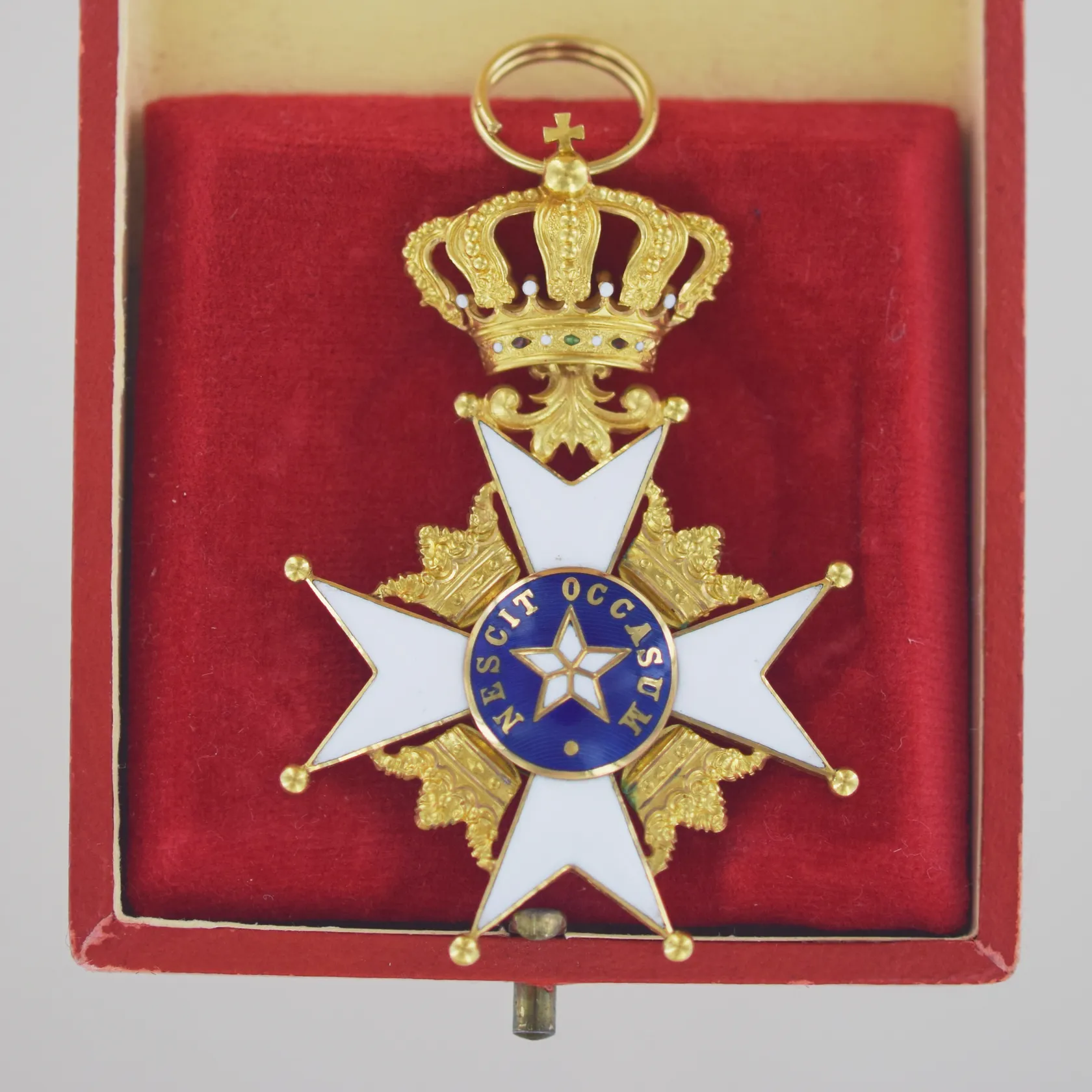 Medalj med emalj, längd 6,5 cm,18K Vikt: 13,9 g.