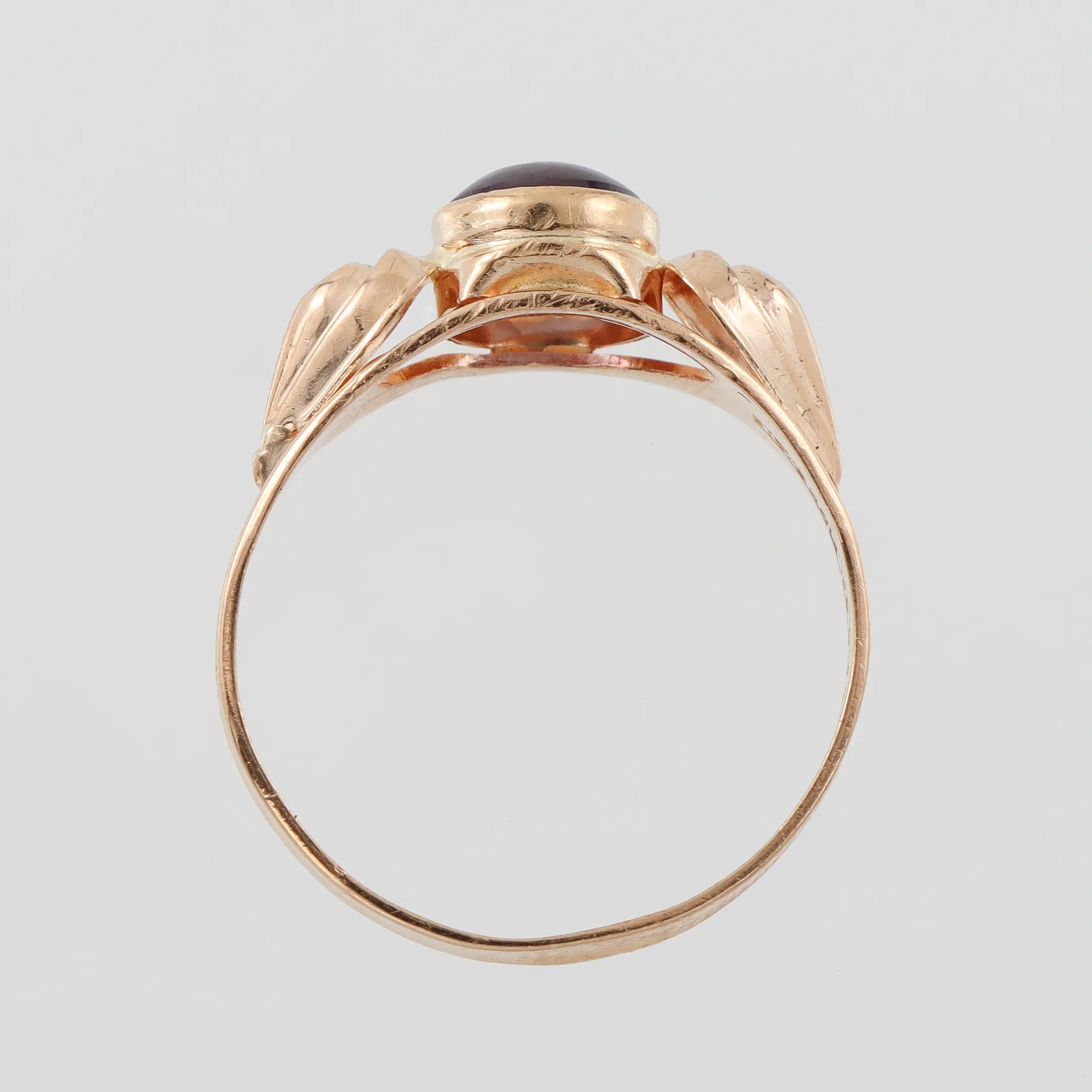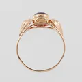 Ring med cabochonslipad lila sten, stl 17mm, bredd 2-7mm, Ceson Guldvaru Ab Göteborg 1960, 18k Vikt: 1,9 g.