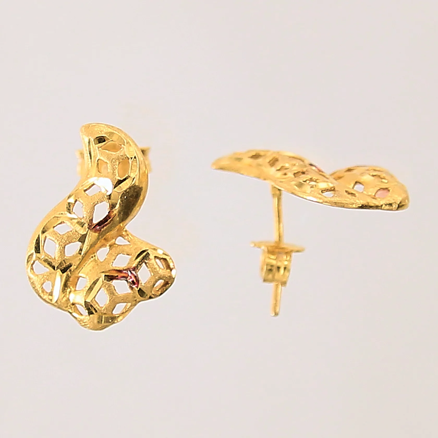 Ett par örhängen med genombruten dekor, längd: 11mm, bredd: 4-11,4mm, något skeva stift, 21K Vikt: 2,7 g.