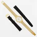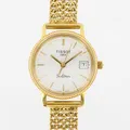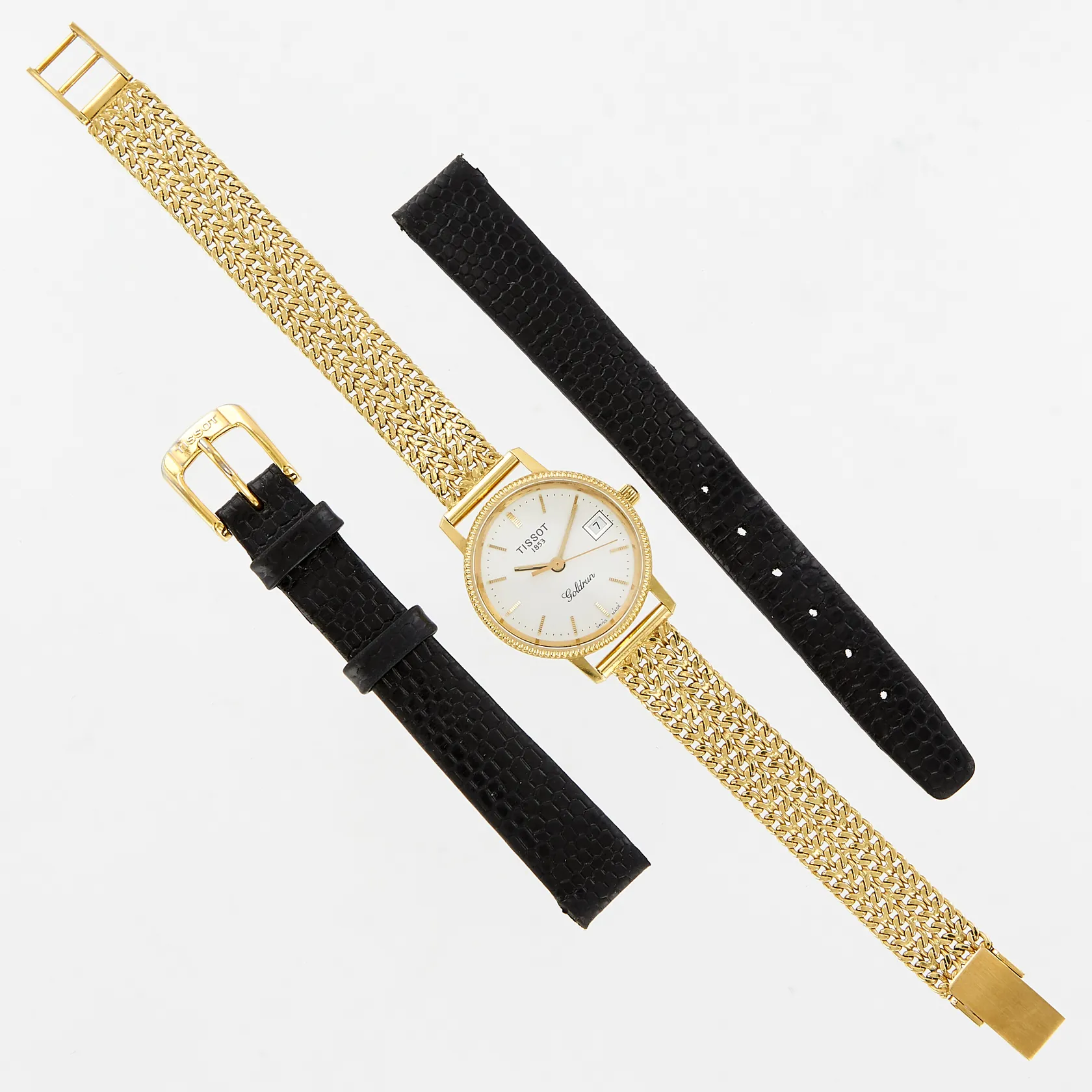 Damur Tissot 24mm, datumfönster, quartz, 18K i boett och länk, 18cm, bredd: 19mm, extra läderband med originalspänne, graverad bakboett, etui medföljer, brv 28,2gram Vikt: 28,2 g.