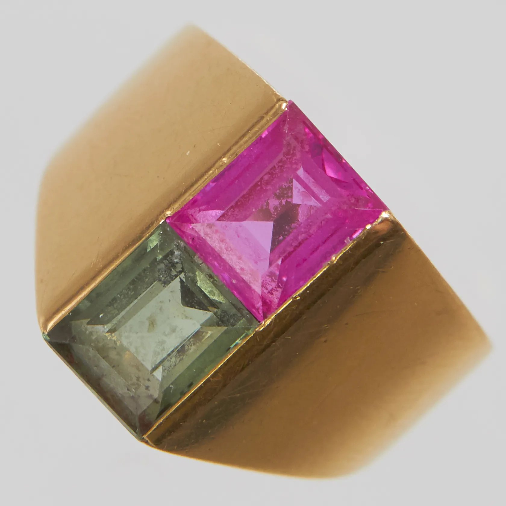 Ring med syntetisk rosa safir samt syntetisk grön spinell, stl17, bredd:3-14mm, Hellerstedts, Finspång 1964, 18K Vikt: 5,1 g.