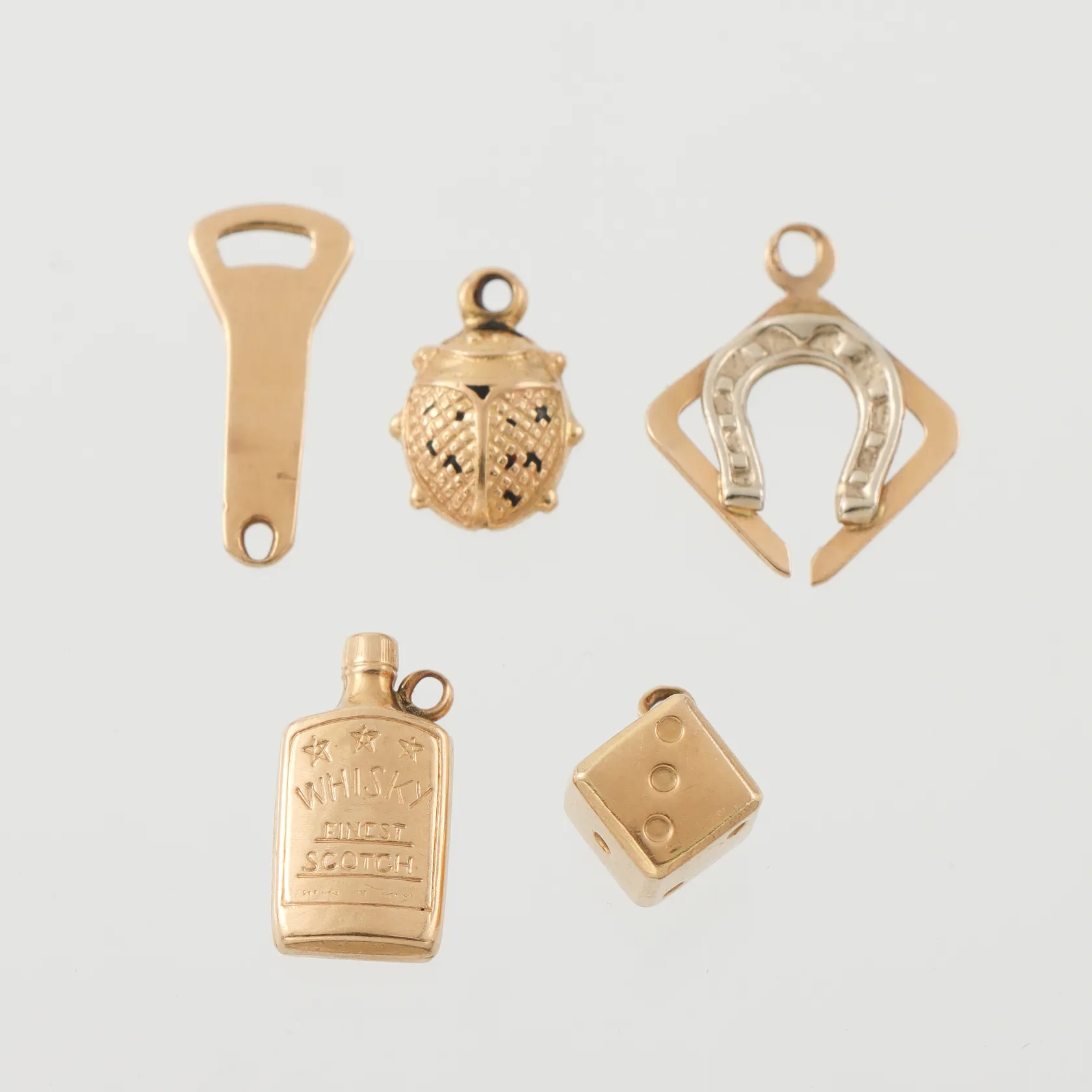 Berlocker 5 st, höjd ca 12-16 mm, inga extraöglor, 18k. Vikt: 3,2 g.