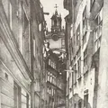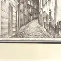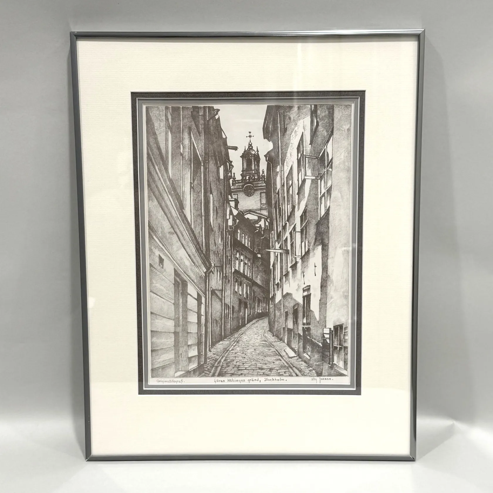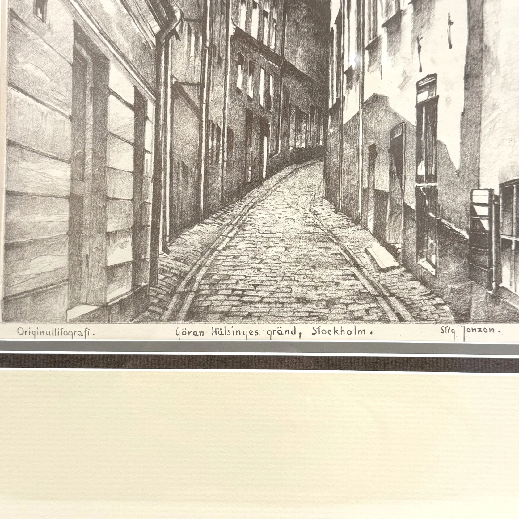 Originallitografi, Stig Jonzon, Göran Hälsinges gränd, Stockholm, rammått 43x33,5cm, bildmått 28x21cm, signerad