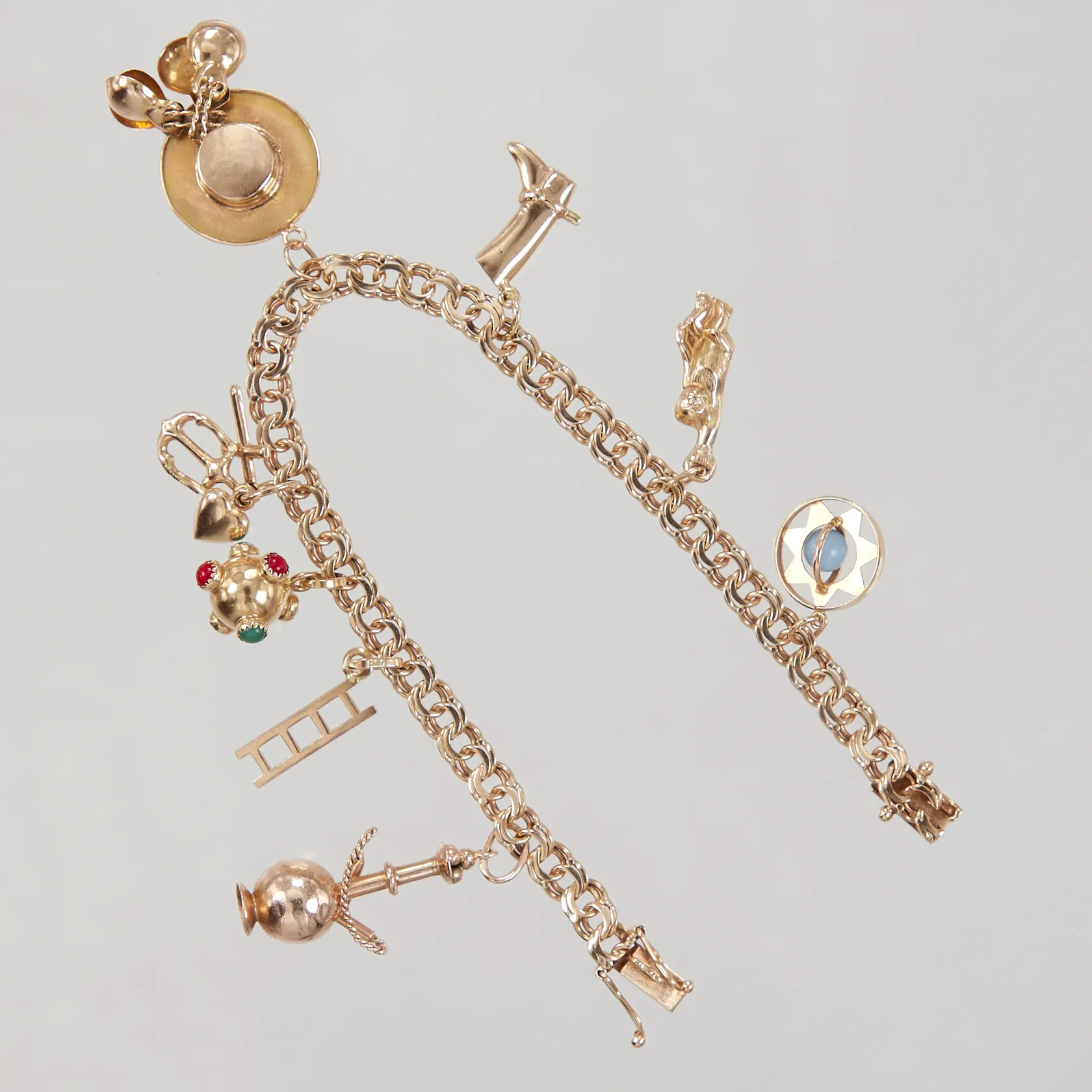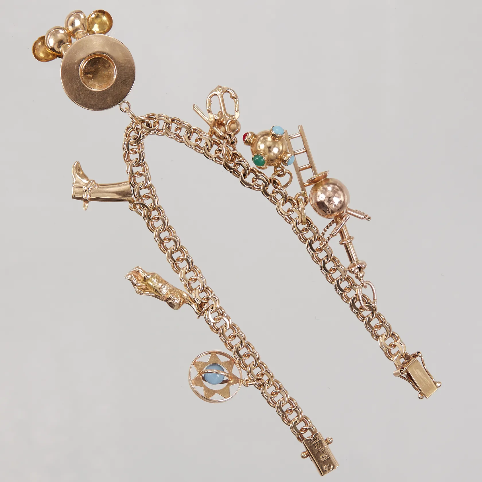 Armband, Bismarck, 18,5cm, bredd 5,2mm, 8 berlocker varav vattenpipa i 14K, 18K, Vikt: 19,3 g.
