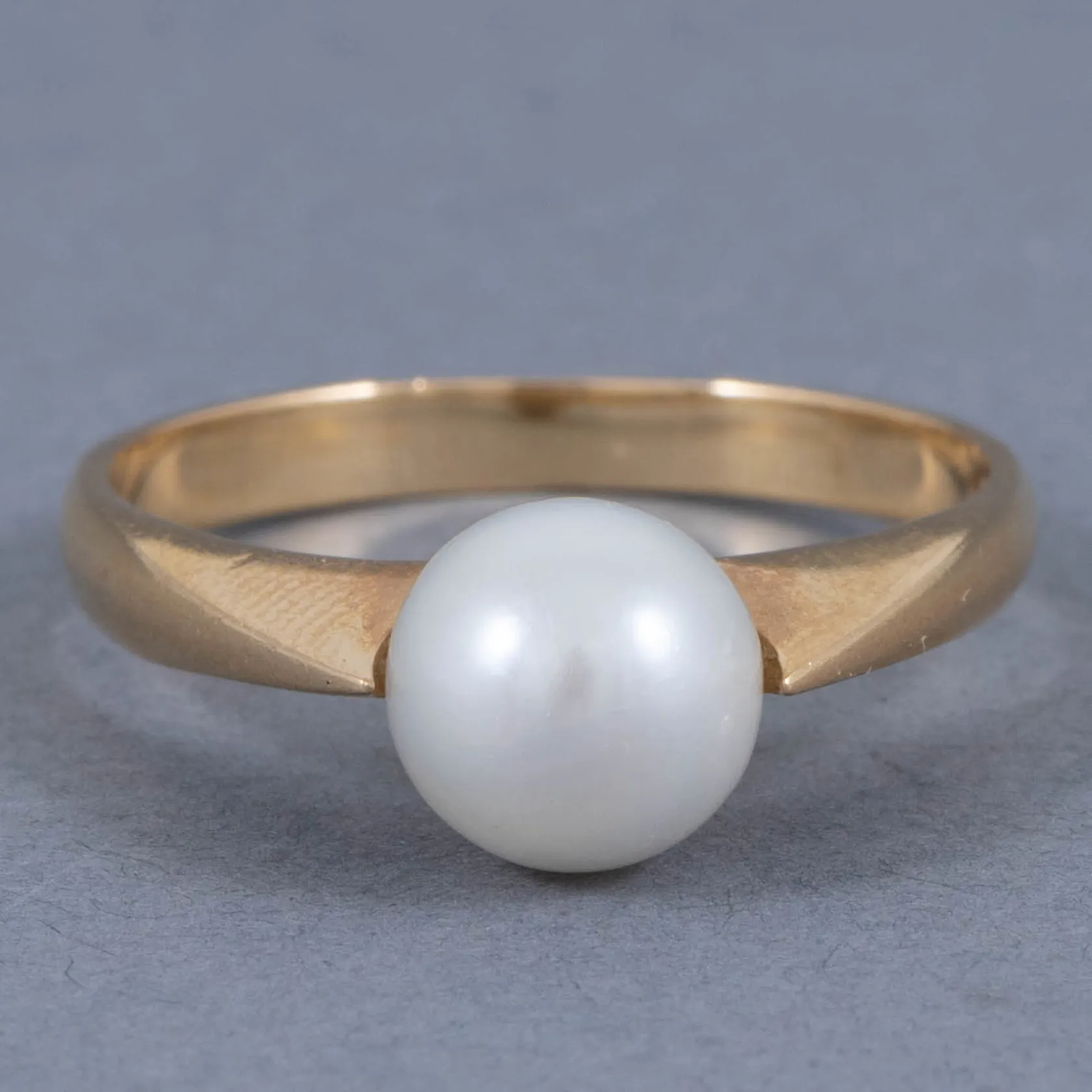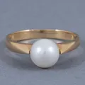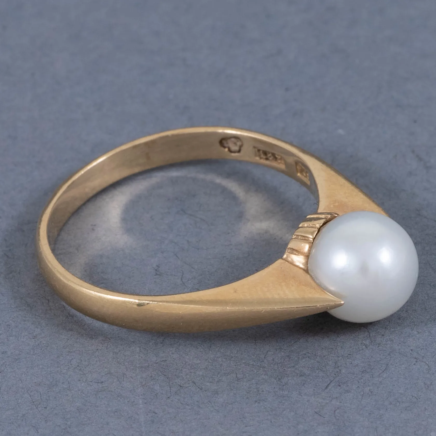 Klassisk ring i 18K guld med en 7,4 mm´s odlad pärla. Den är 2,6 mm bred, är i storlek 18¼ och väger 3,8g. Tillverkad 1974 av G Dahlgren & Co i Malmö. Vikt: 3,8 g.