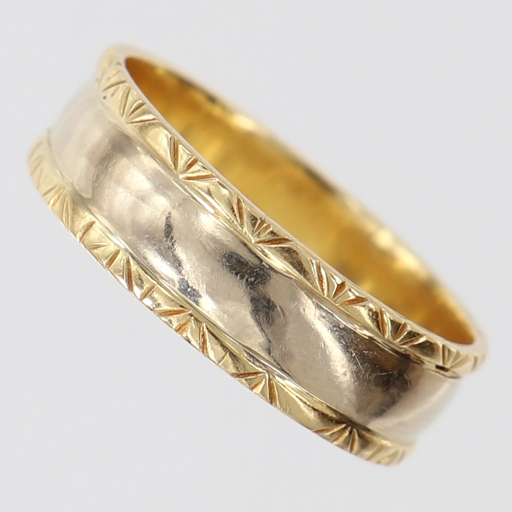 Ring, stl: 19½, bredd 6,5mm, tvåfärgat, gravyr, ostämplat, 14K. Vikt: 5,3 g.
