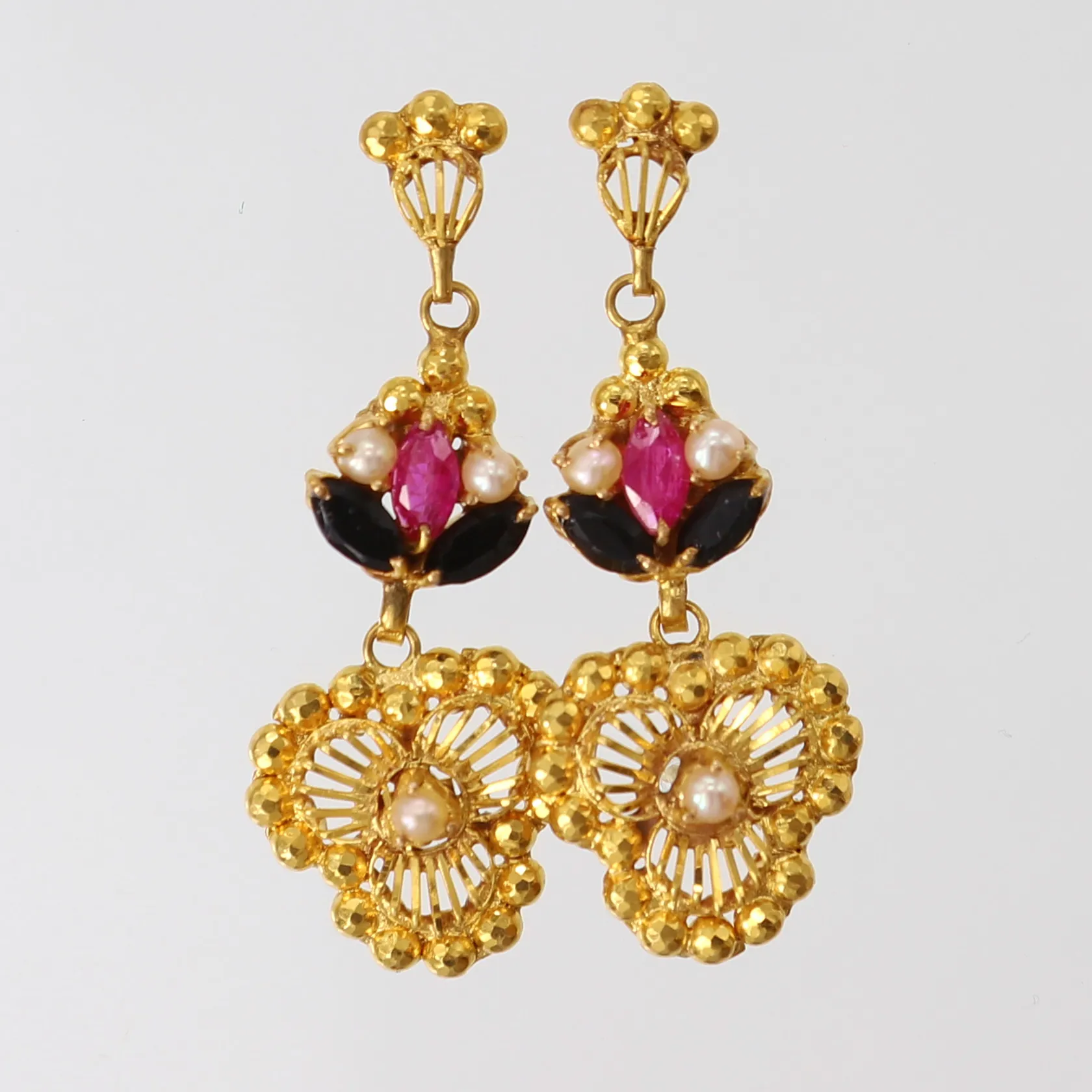 Ett par örhängen med stenar och pärlor, 35x13,5mm, snurrebussar saknas, ostämplat 18K. Vikt: 4 g.