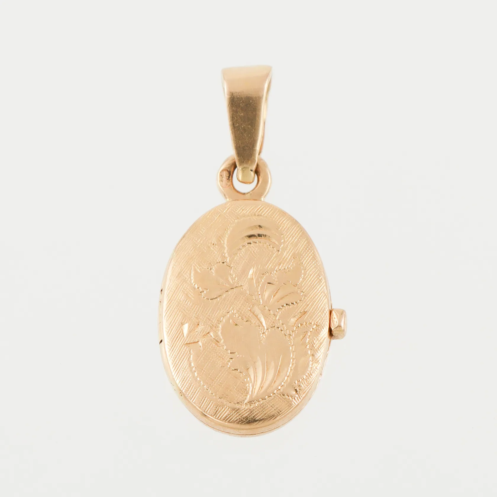Fotomedaljong mönstrad, höjd med ögla 25 mm, 18k. Vikt: 2,8 g.