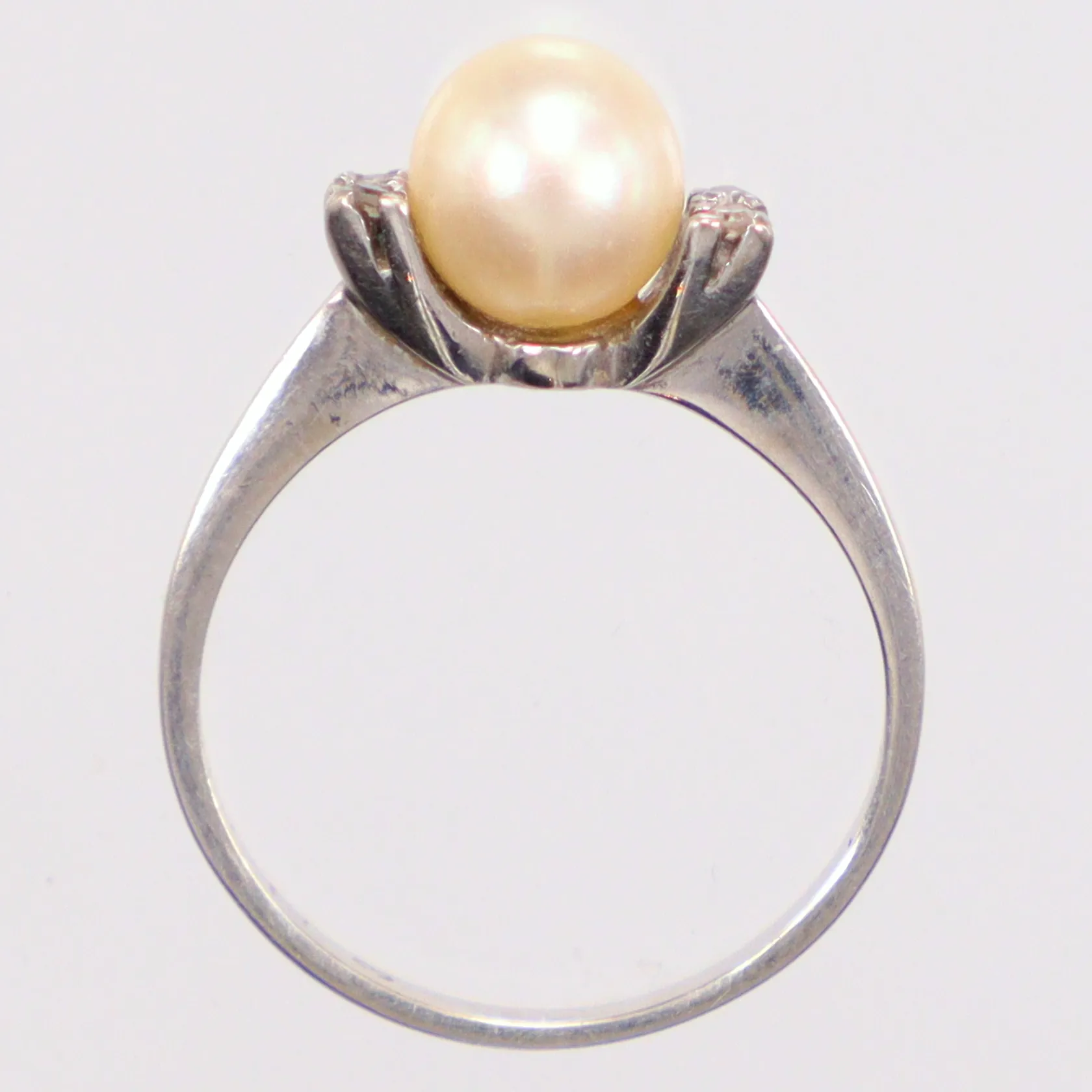 Ring vitguld pärla Ø6,9mm, Ø17, små vita stenar, 18K Vikt: 2,7 g.