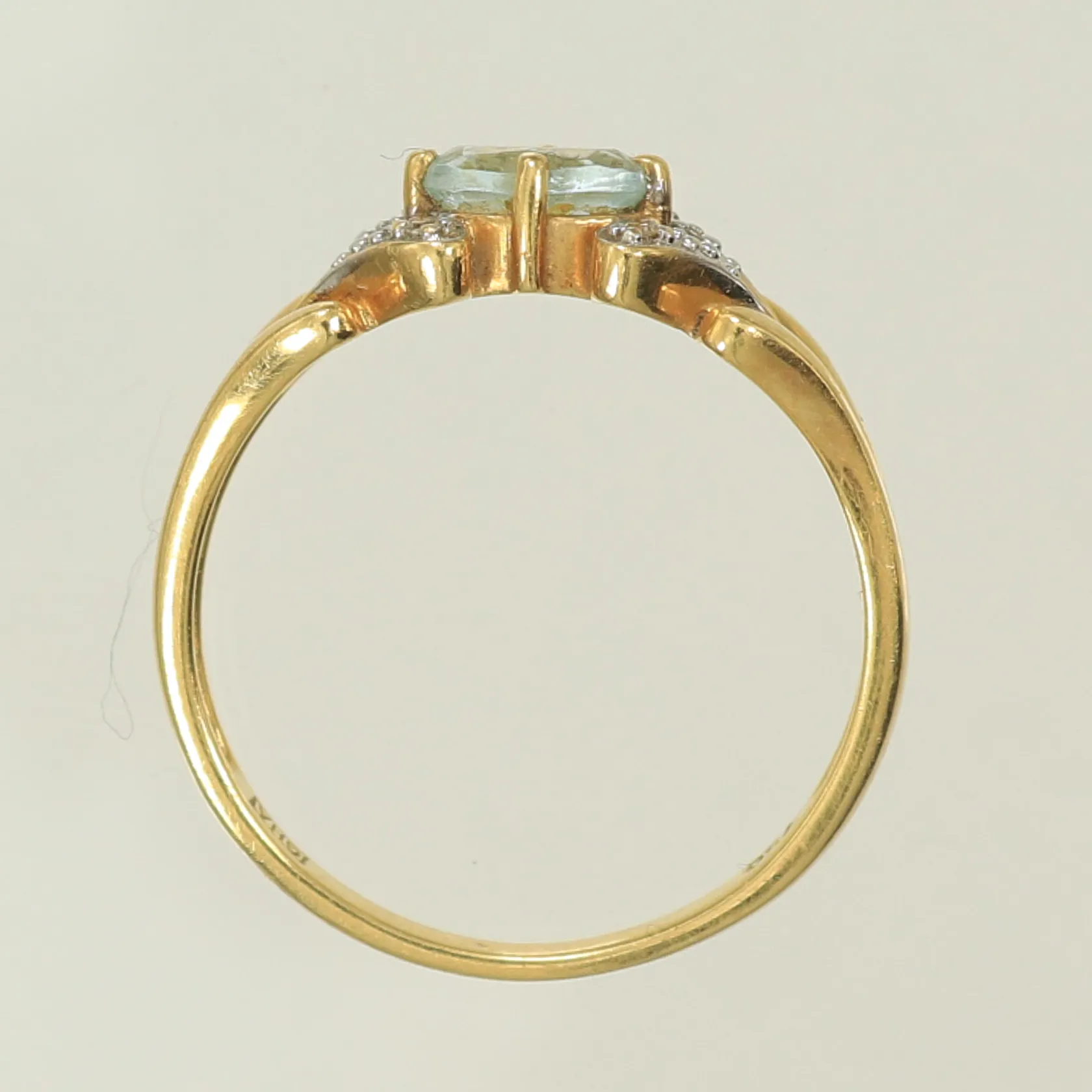Ring med 4 diamanter 0,003 ct/st och ljusblå sten, stl 18, bredd 2-7mm, 18K 2,9g Vikt: 2,9 g.