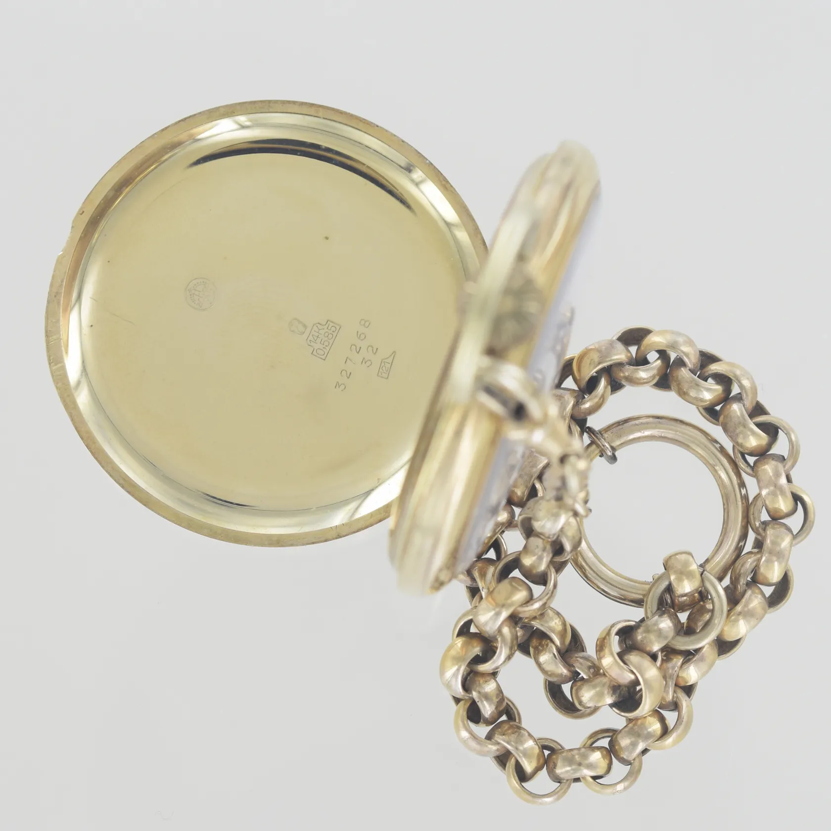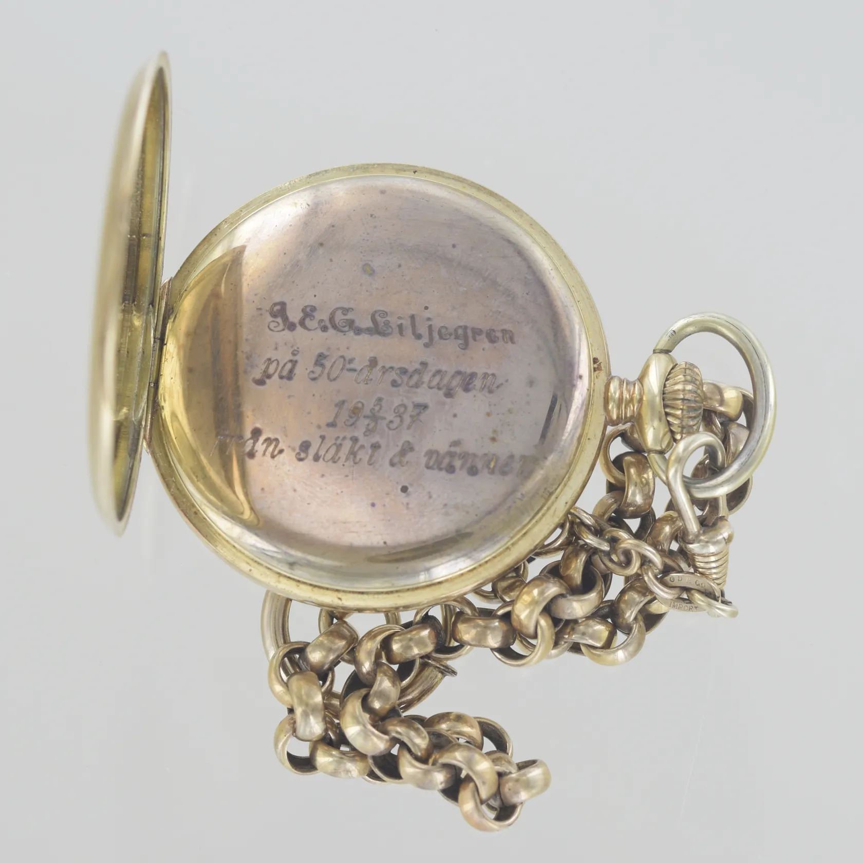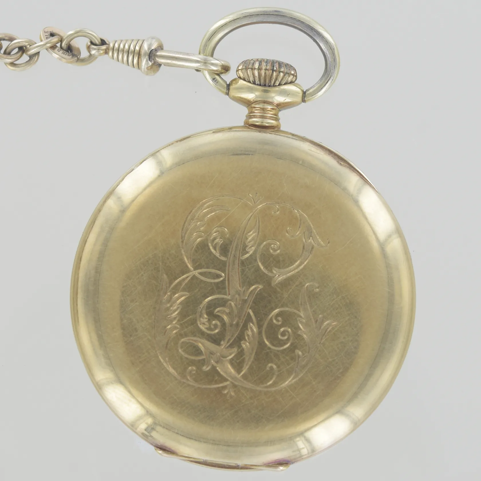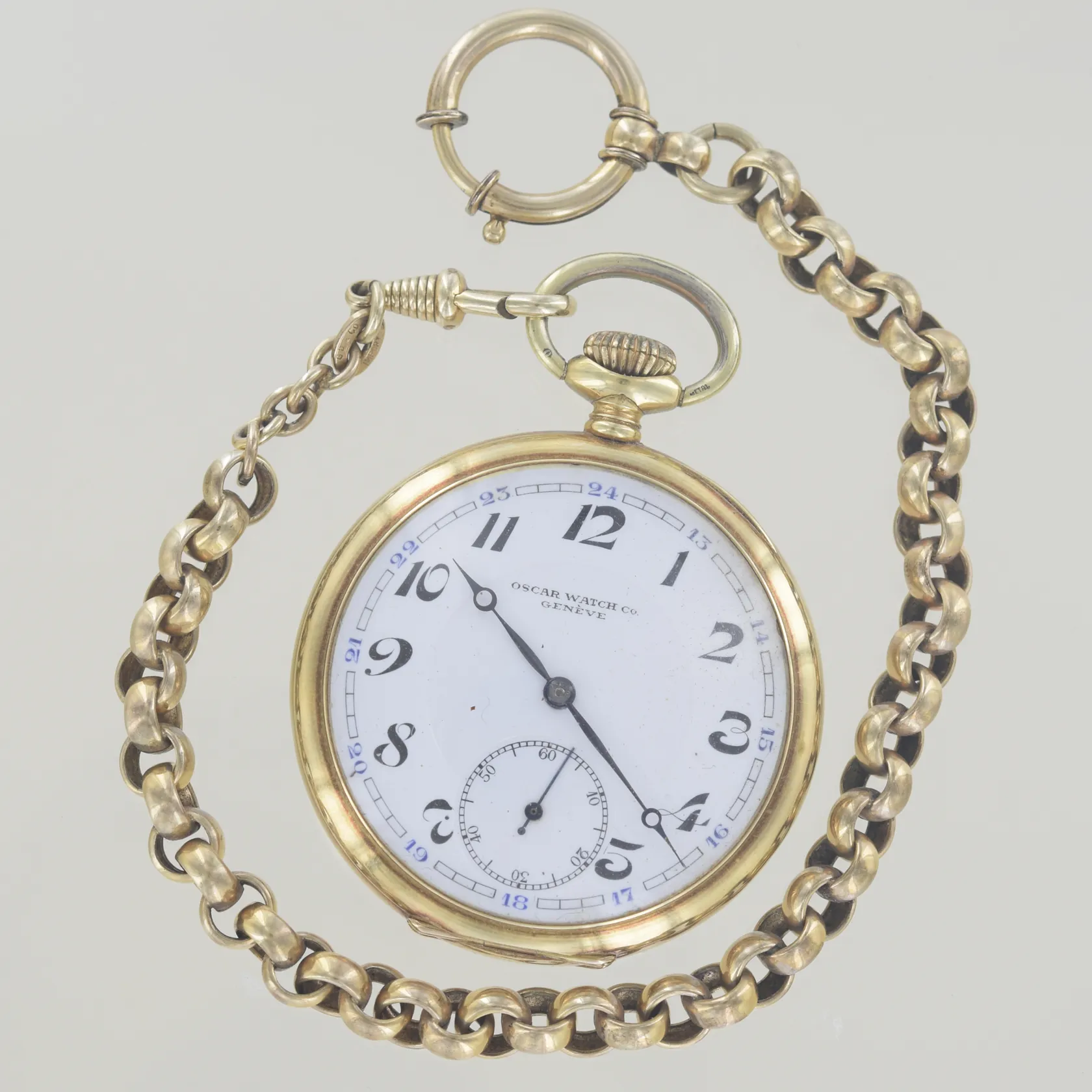 Fickur Oscar Watch Co Genève boett nummer 32726832, diam 48,8 mm, graverad, 14K, 72,1 gr + kedja guld doublé