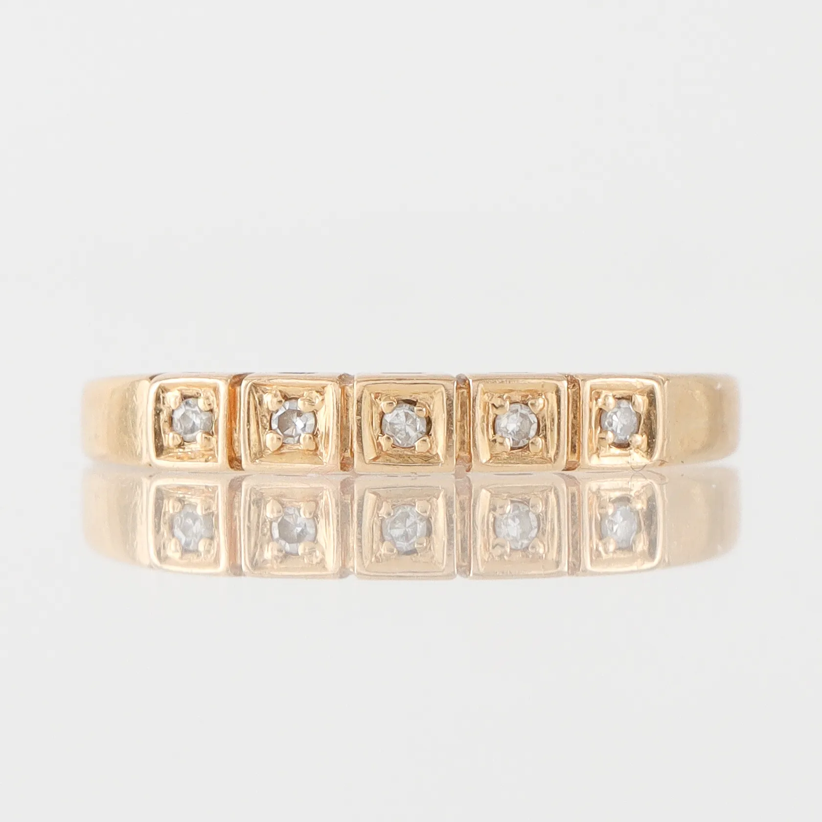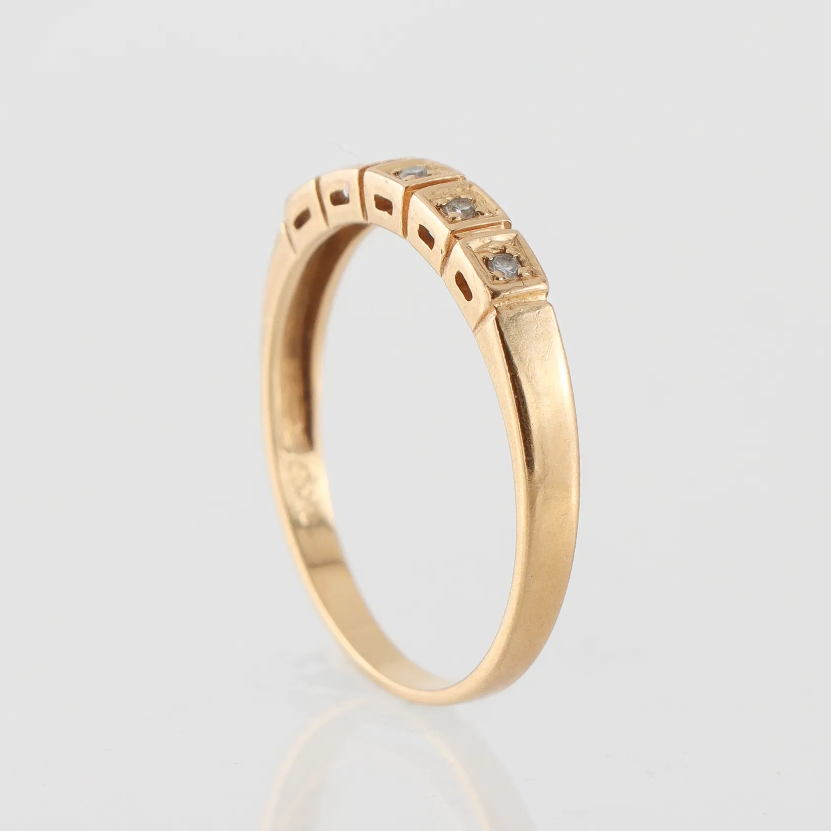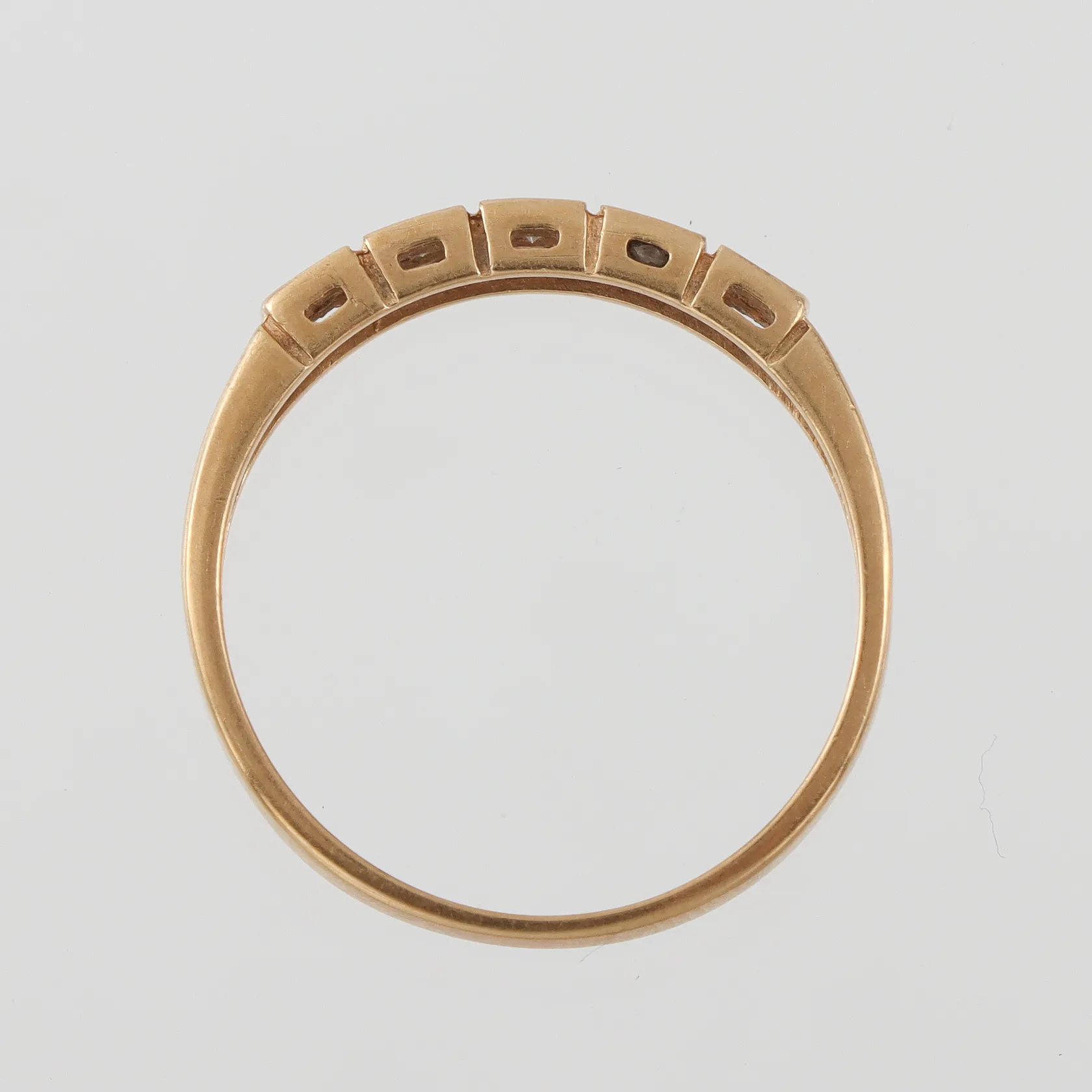 Ring med 5 st små diamanter, storlek 16 ¼ mm, bredd ca 1.7-2.7 mm, 18k. Vikt: 1,6 g.