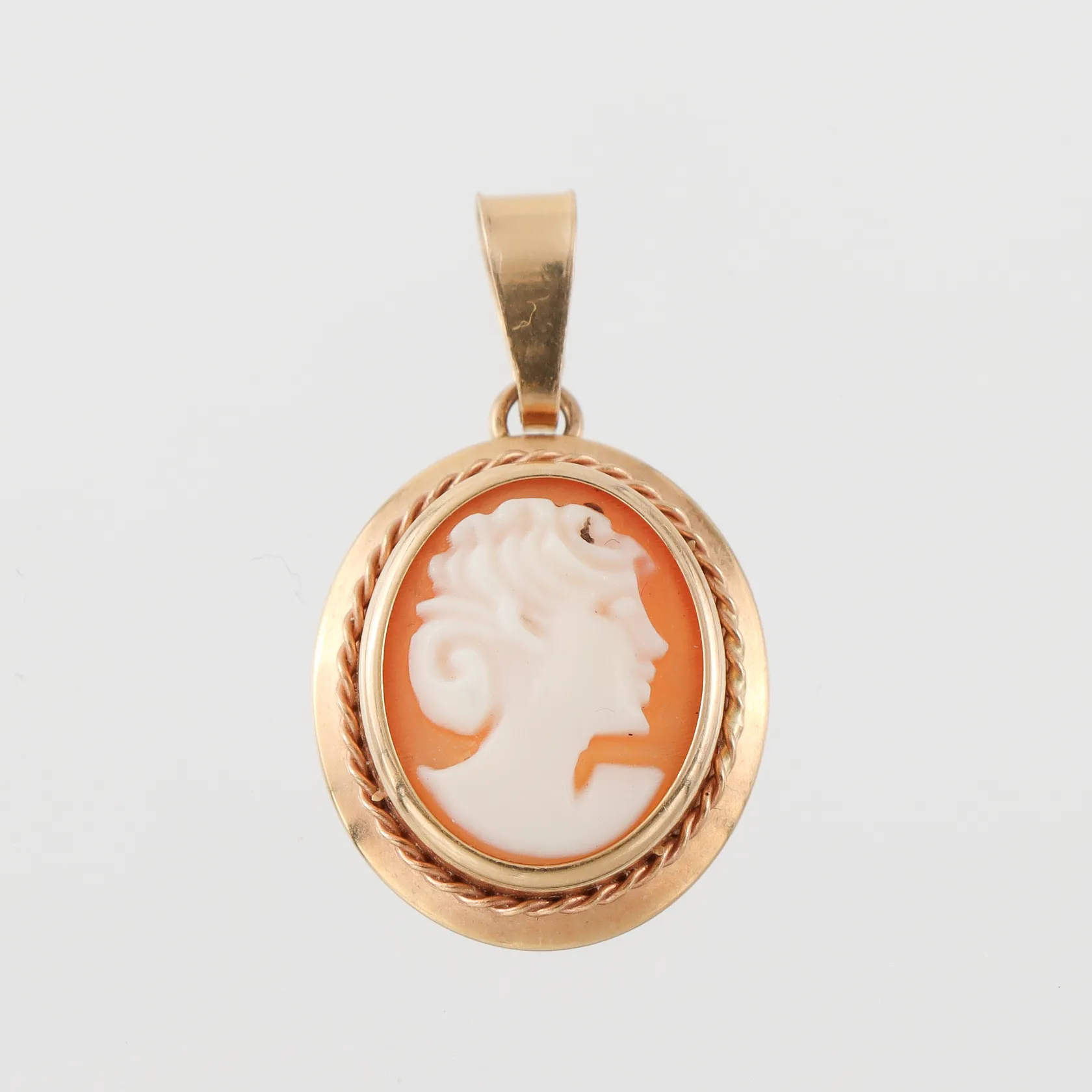 Caméhänge, höjd med ögla ca 22 mm, 18k. Vikt: 1,3 g.