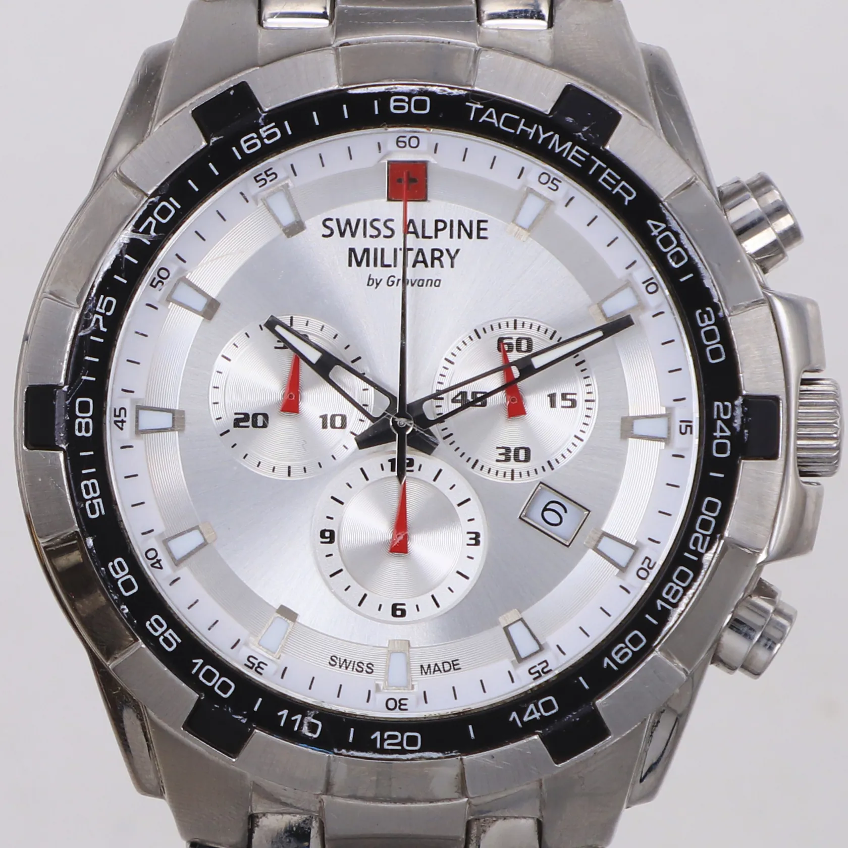 Herrur Swiss Alpine Military, Stål, quartz, referensnummer: 7043.9LE, Ø ca 46mm, stållänk, datum, kronograf, manual, bruksslitage, inga övriga tillbehör.