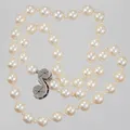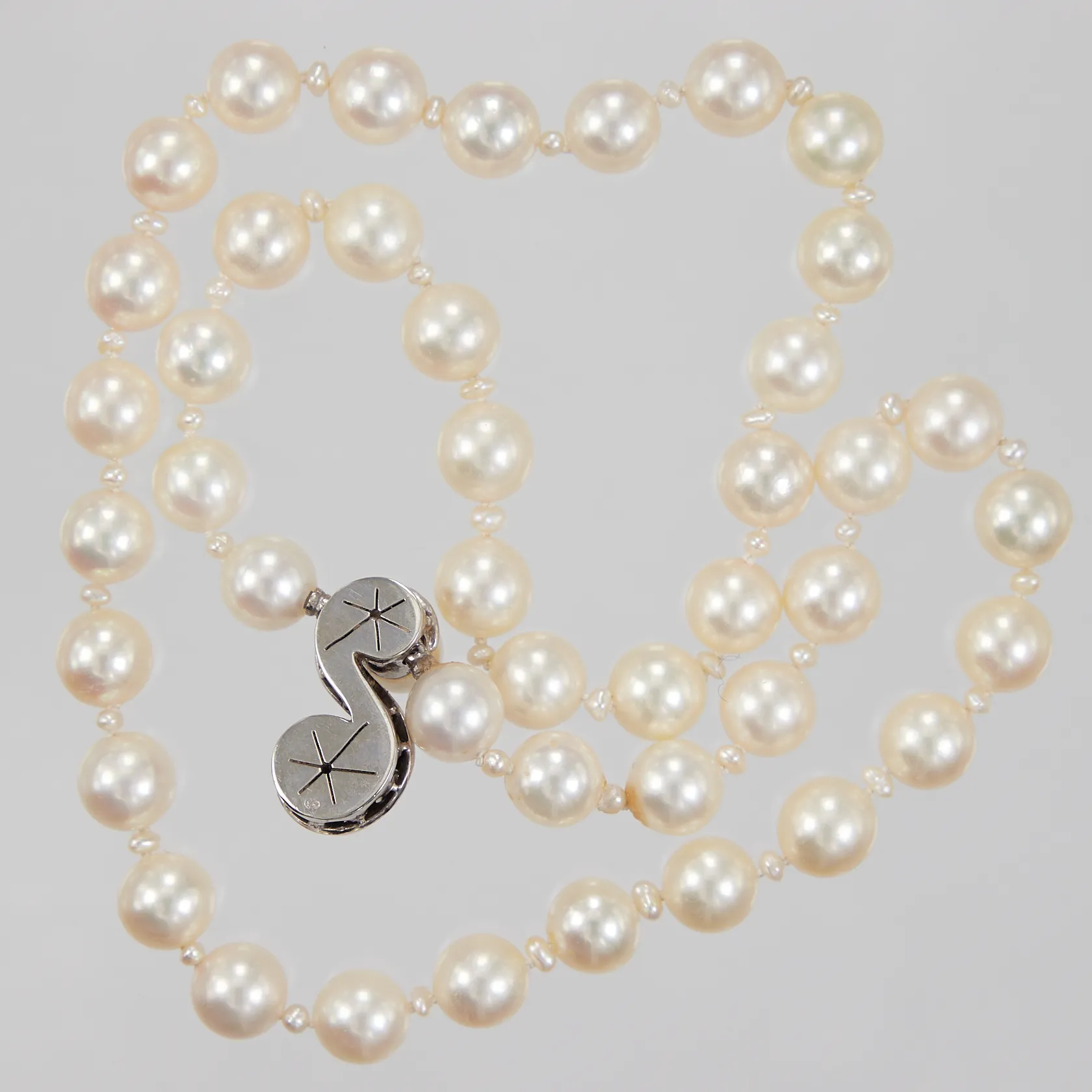 Pärlcollier längd 46cm, odlade pärlor Ø ca 8mm, samt mindre biwa pärlor, lås med diamanter ca 12x 0,005-0,02ct, vitguld, 18K. Bruttovikt 41,4g