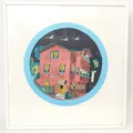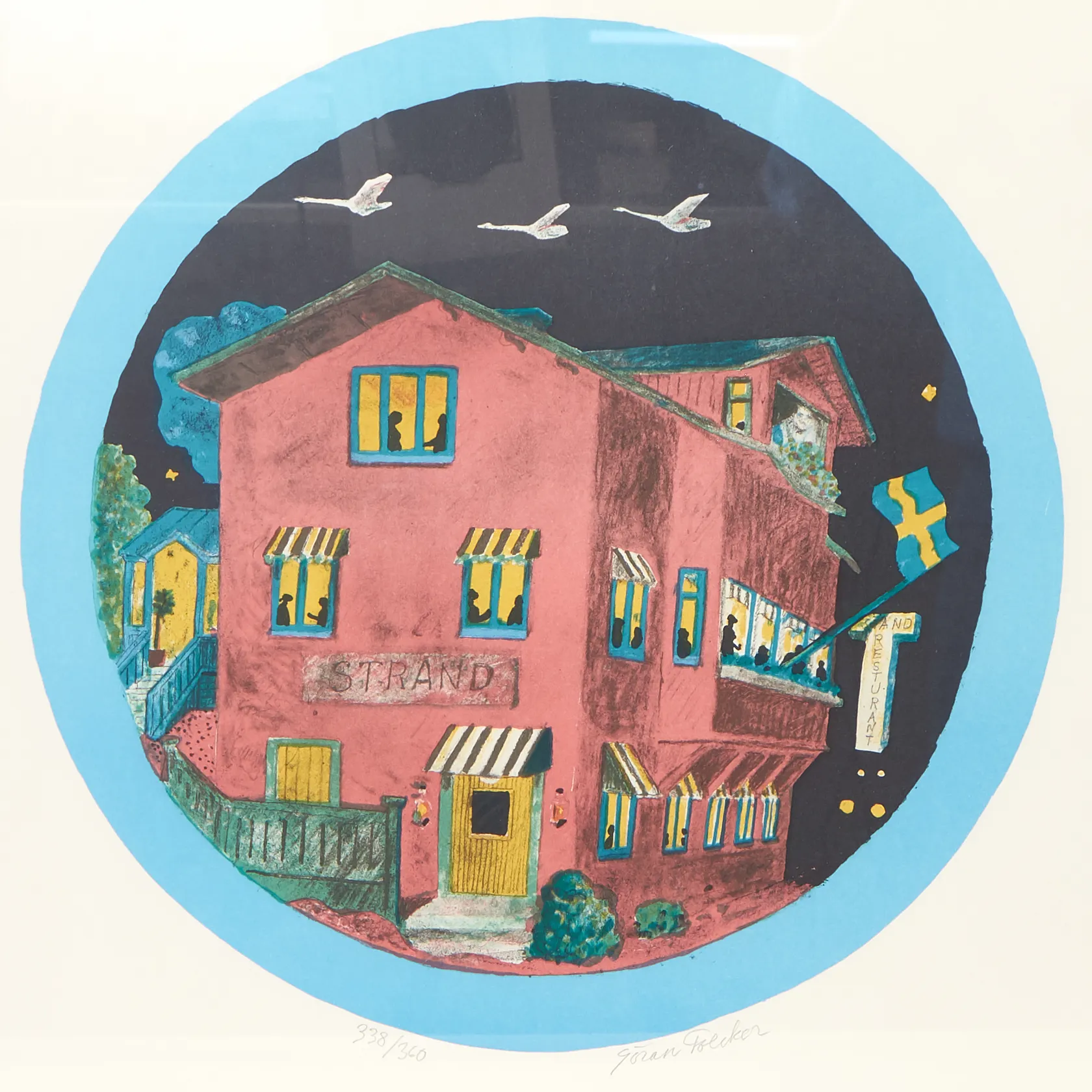 Tavla av Göran Folcker, Strandrestaurang, färglitografi, signerad och numrerad 338/360, bildmått Ø ca 35mm, rammått 51x53cm Skickas med postpaket. Omfattas av BUS-avgift.