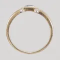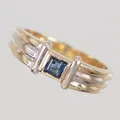 Ring stl 16¾, bredd 2,8-6,5mm, blå sten, små nagg, 14K, Vikt: 4,3 g.
