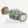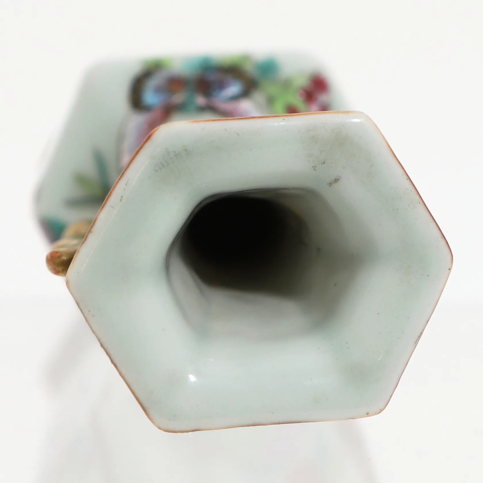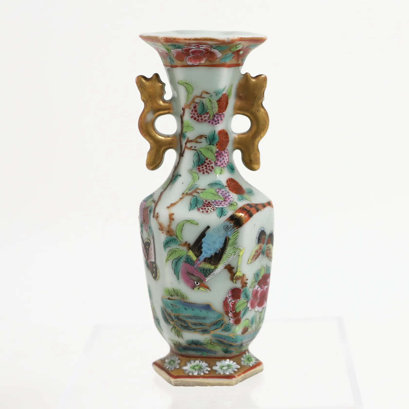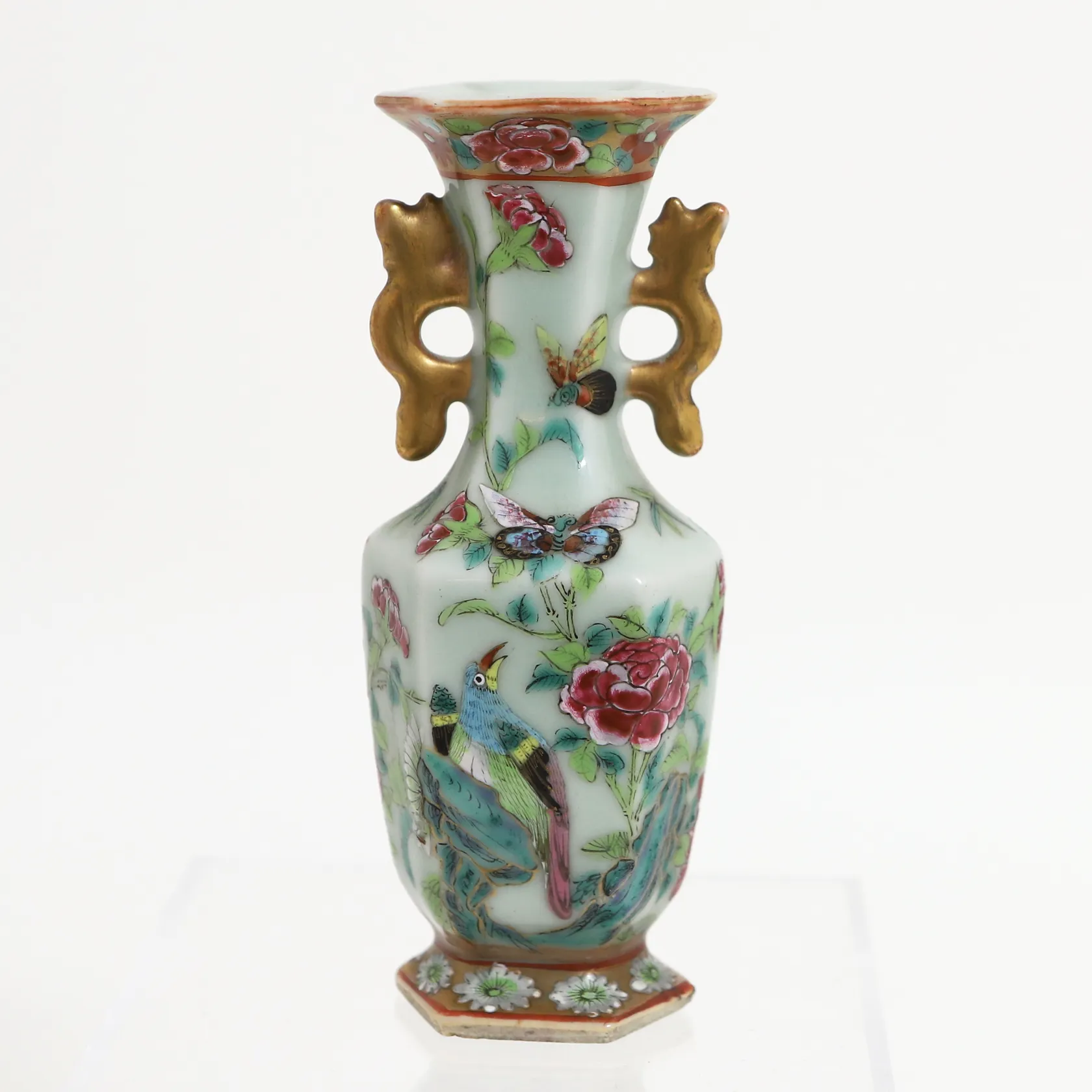 Vas Famille rose Kina 1800-talets mitt, grön underglasyr dekorerat med fåglar samt växtlighet, höjd: 14cm, mindre dekorslitage samt ett minimalt kantnagg.