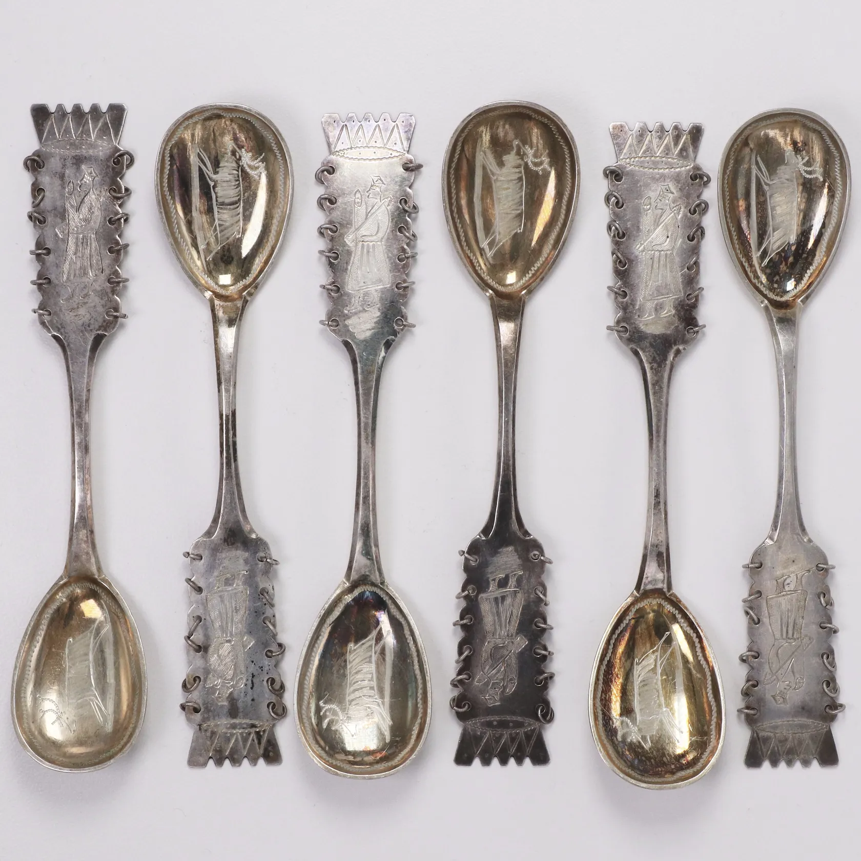 Sex kaffeskedar samisk motiv, längd 12cm, delvis förgylld, Osk Strömbergs Eftr, år 1931, sliten Osk Strömbergs Eftr etui, gravyr, silver 830/1000 Vikt: 72,2 g.