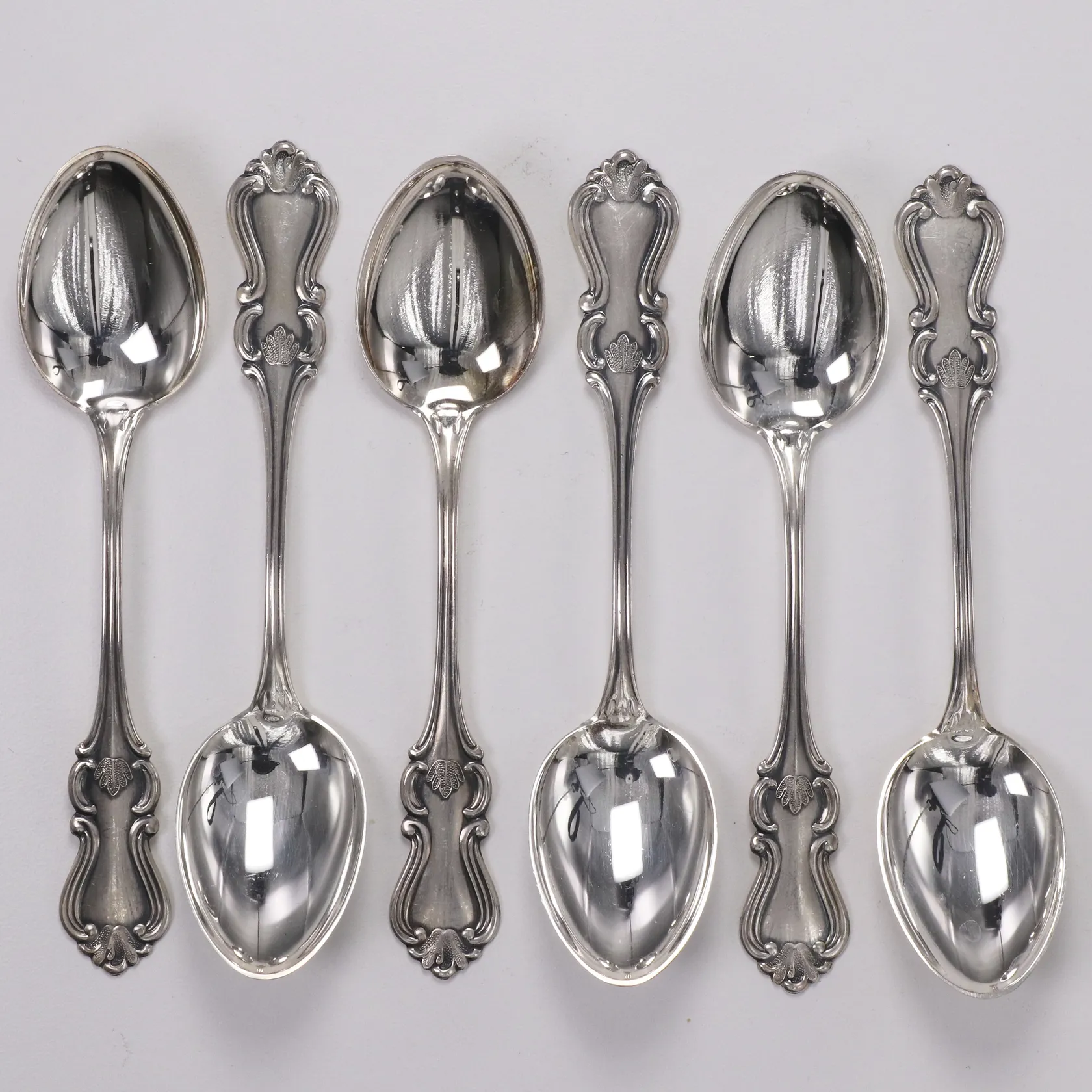 6 Kaffeskedar, modell Olga, längd 11,8cm, gravyr, silver 830/1000 Vikt: 78,8 g.