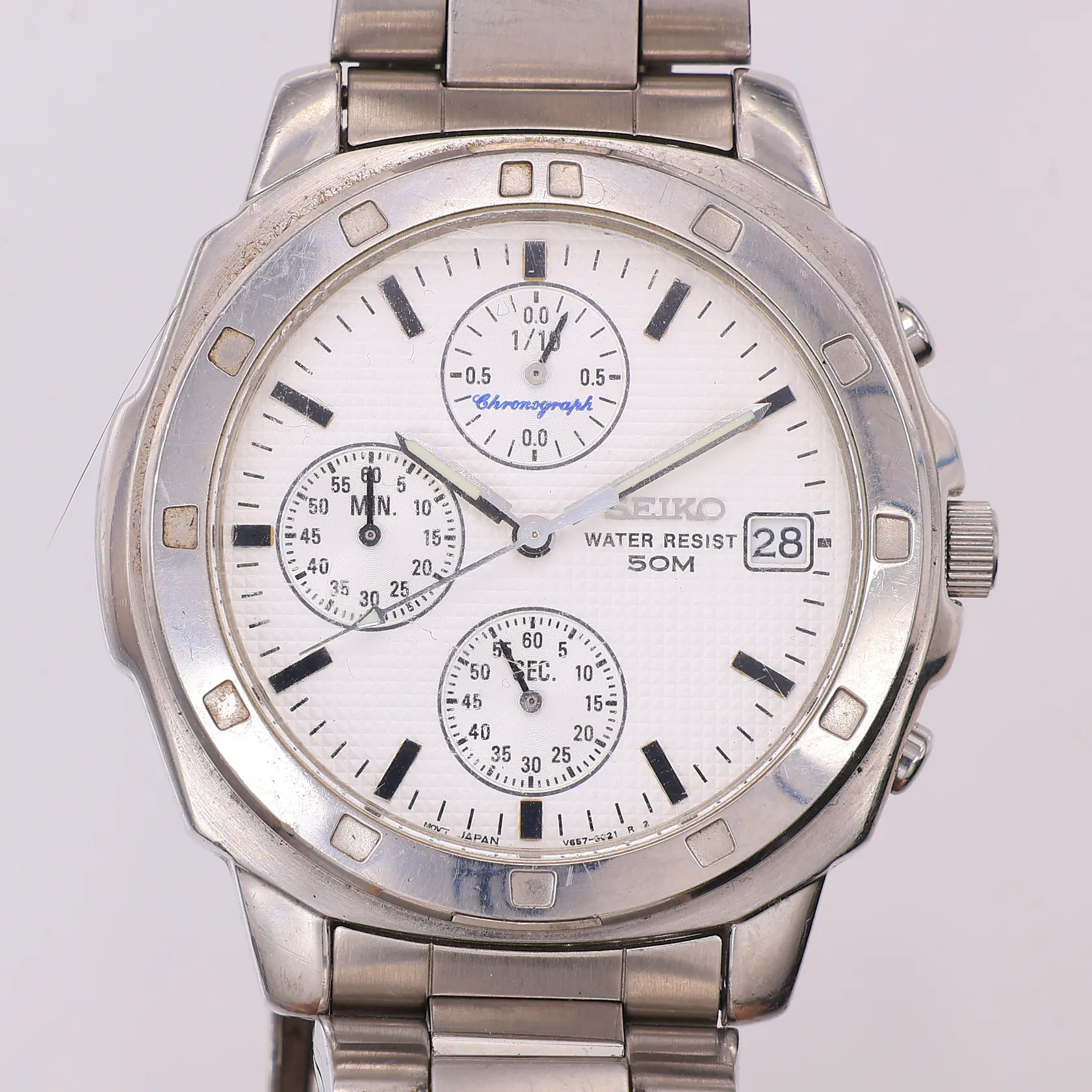 Herrur Seiko, kronograf, quartz, Ø39mm, referensnr V657-9010, serienr 7N0342, stål, stålband med viklås, ca 21cm, står still