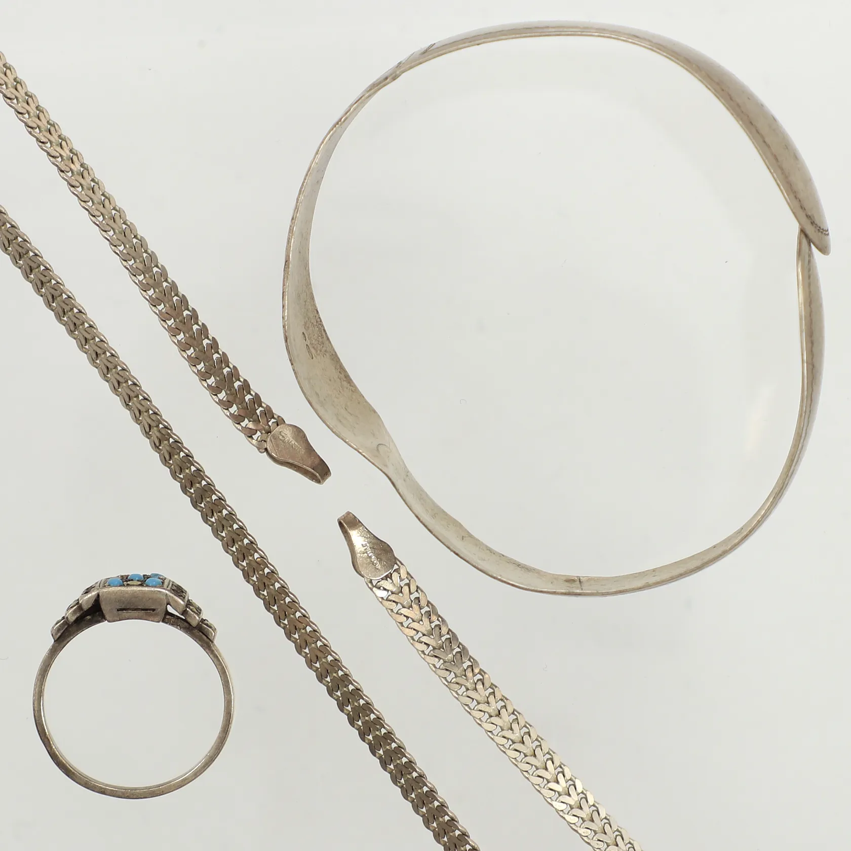 Diverse silver, skevt, defekt, saknar stenar, silver Vikt: 22 g.
