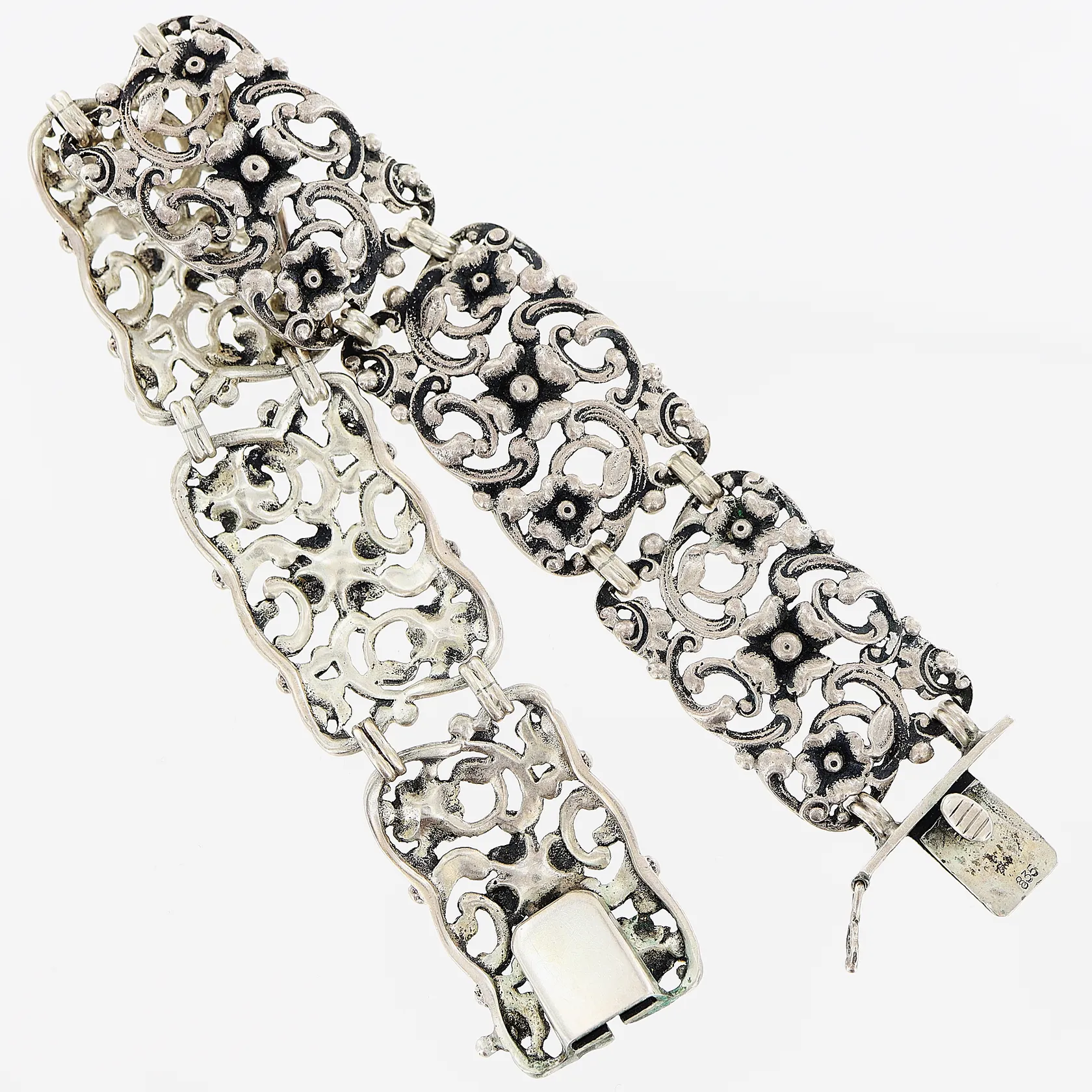 Armband 20cm, bredd 2cm, genombrutet mönster med blommor, silver 835/1000 Vikt: 31,3 g.