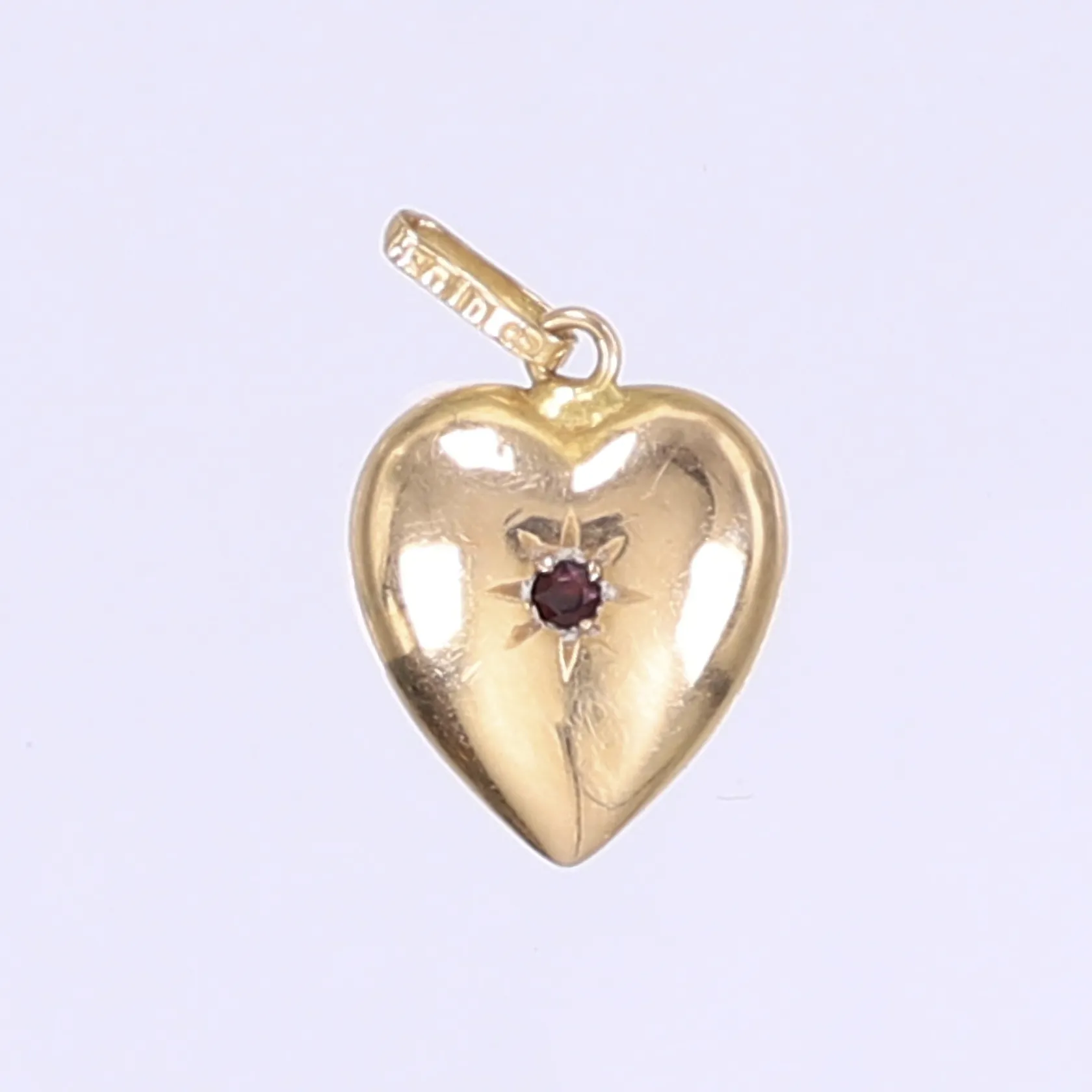 Hänge hjärta med röd sten längd inkl ögla 20mm bredd 12mm gravyr 18K Vikt: 0,9 g.