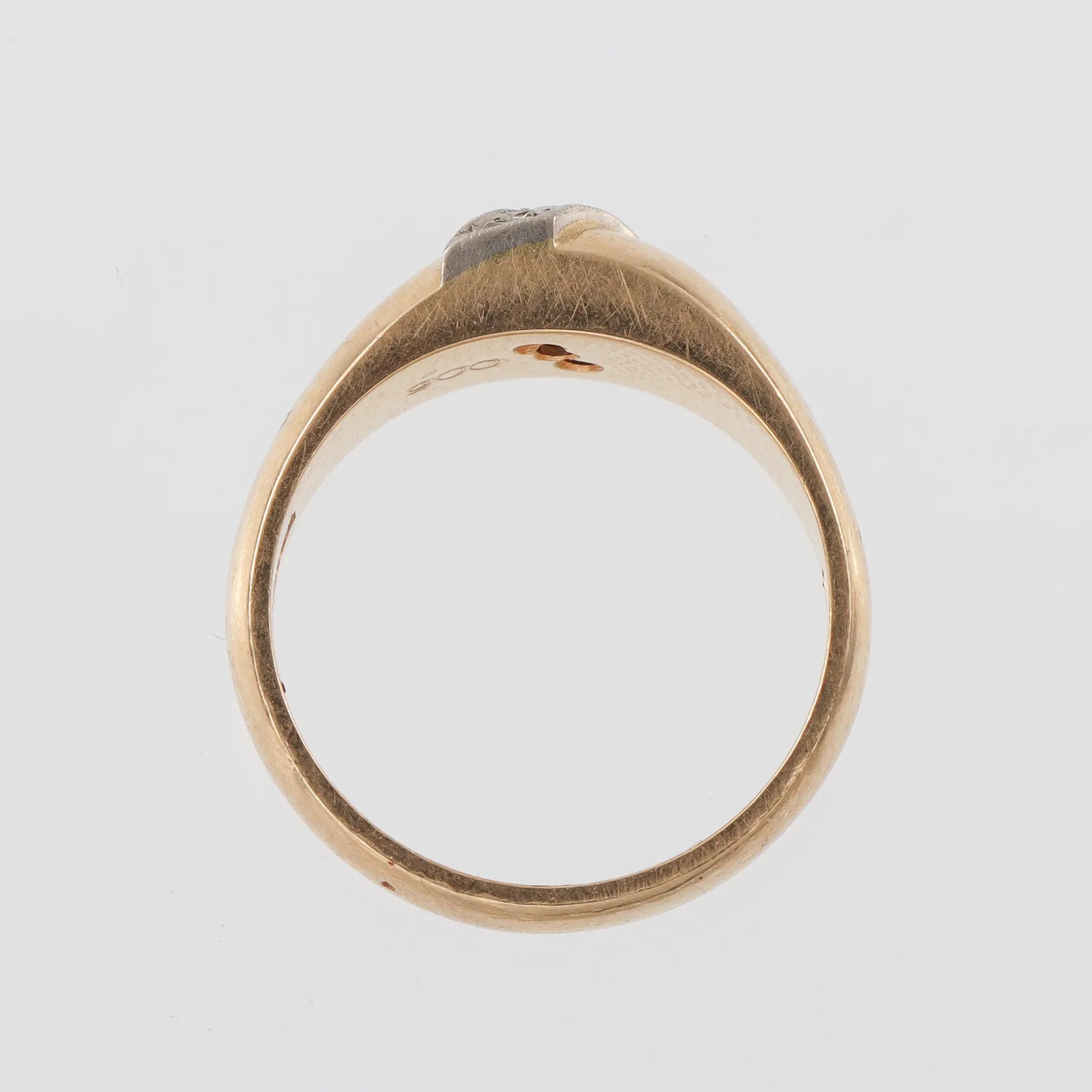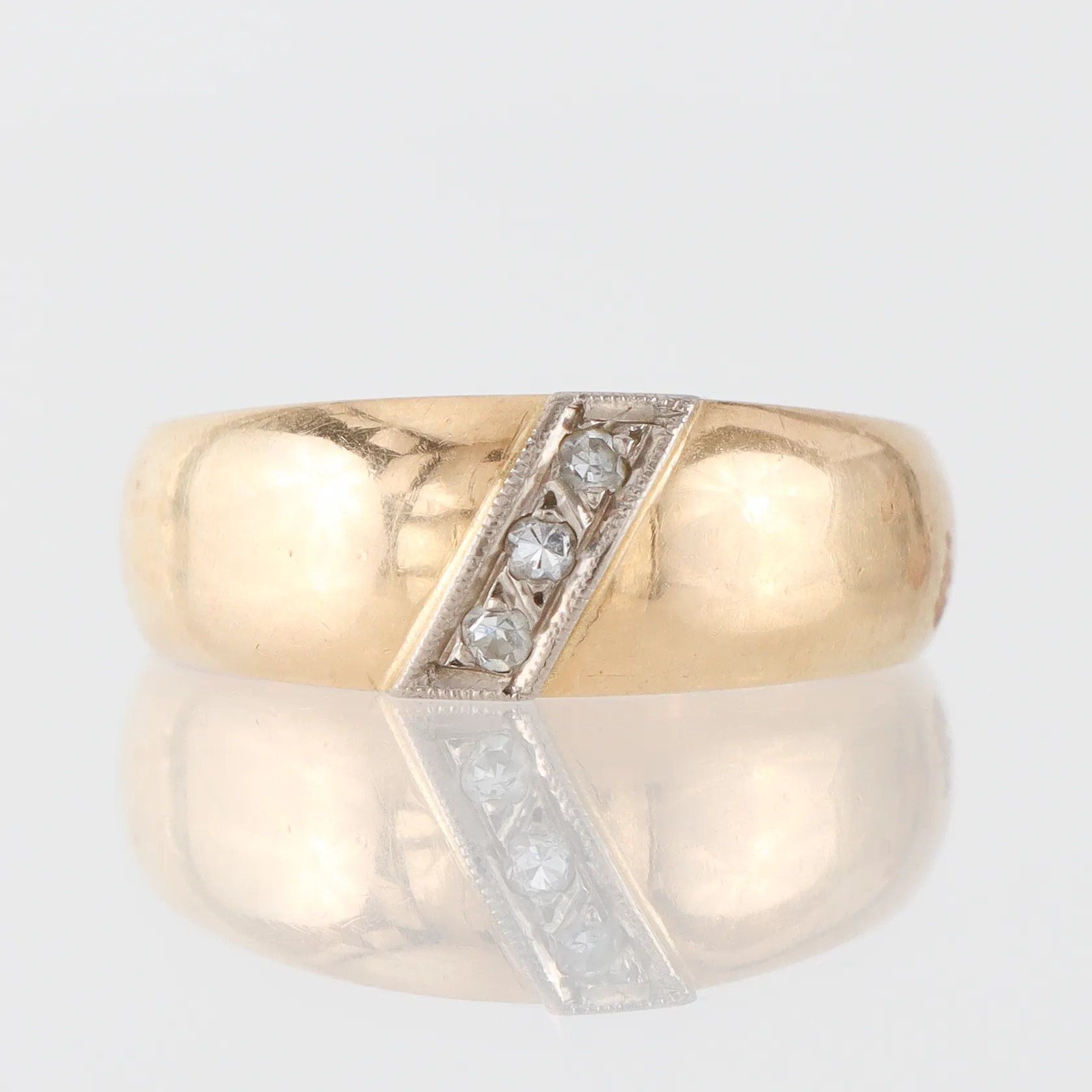 Ring 18k med 3 st diamanter totalt 0,06ct, storlek 16 ½ mm,bredd 3.8-6.8 mm, Guldvaruaktiebolaget G. Dahlgren & Co Ab Malmö 1985. Vikt: 8 g.