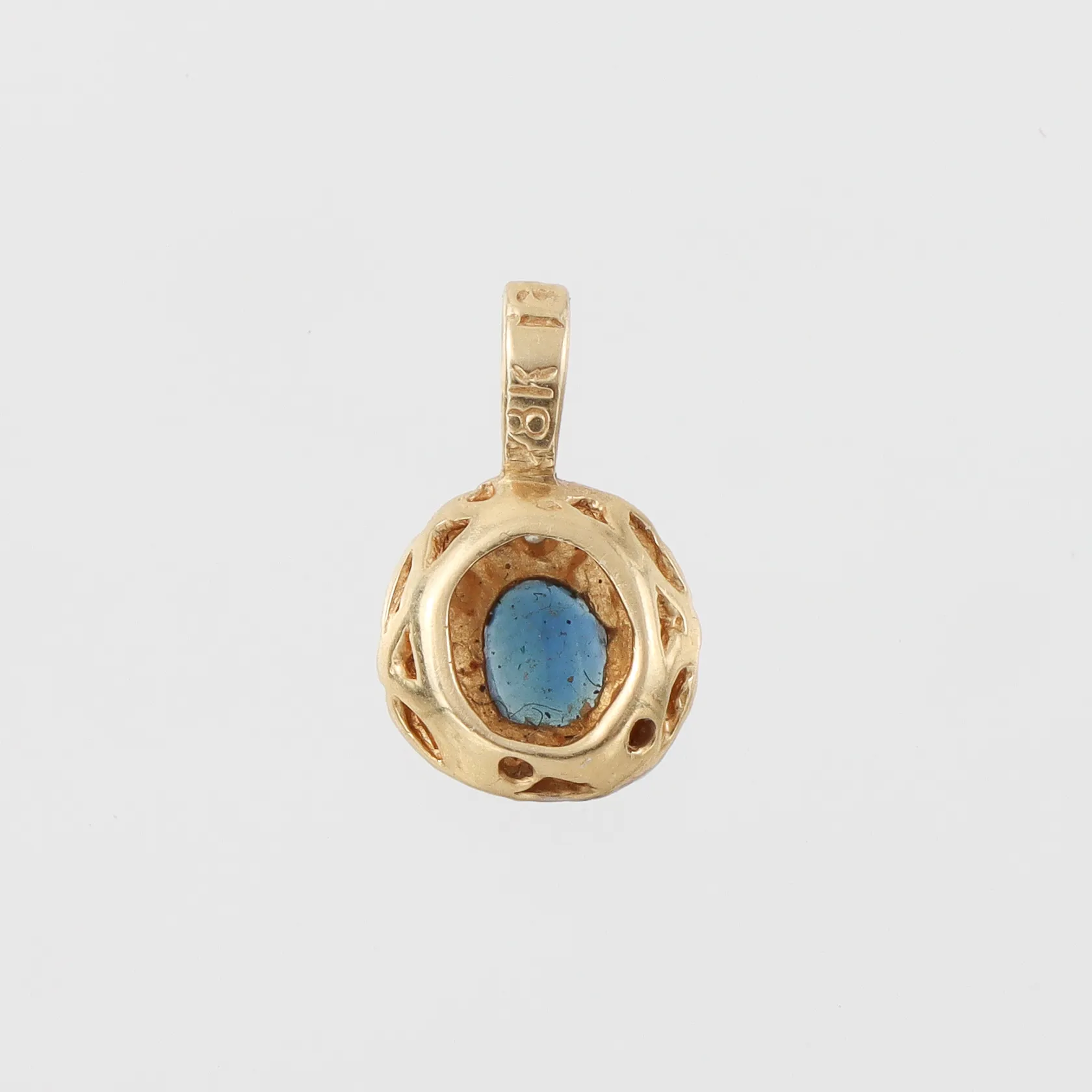 Hänge 18k med safir , något osymetrisk, ,höjd ca 11.4 mm. Vikt: 0,6 g.