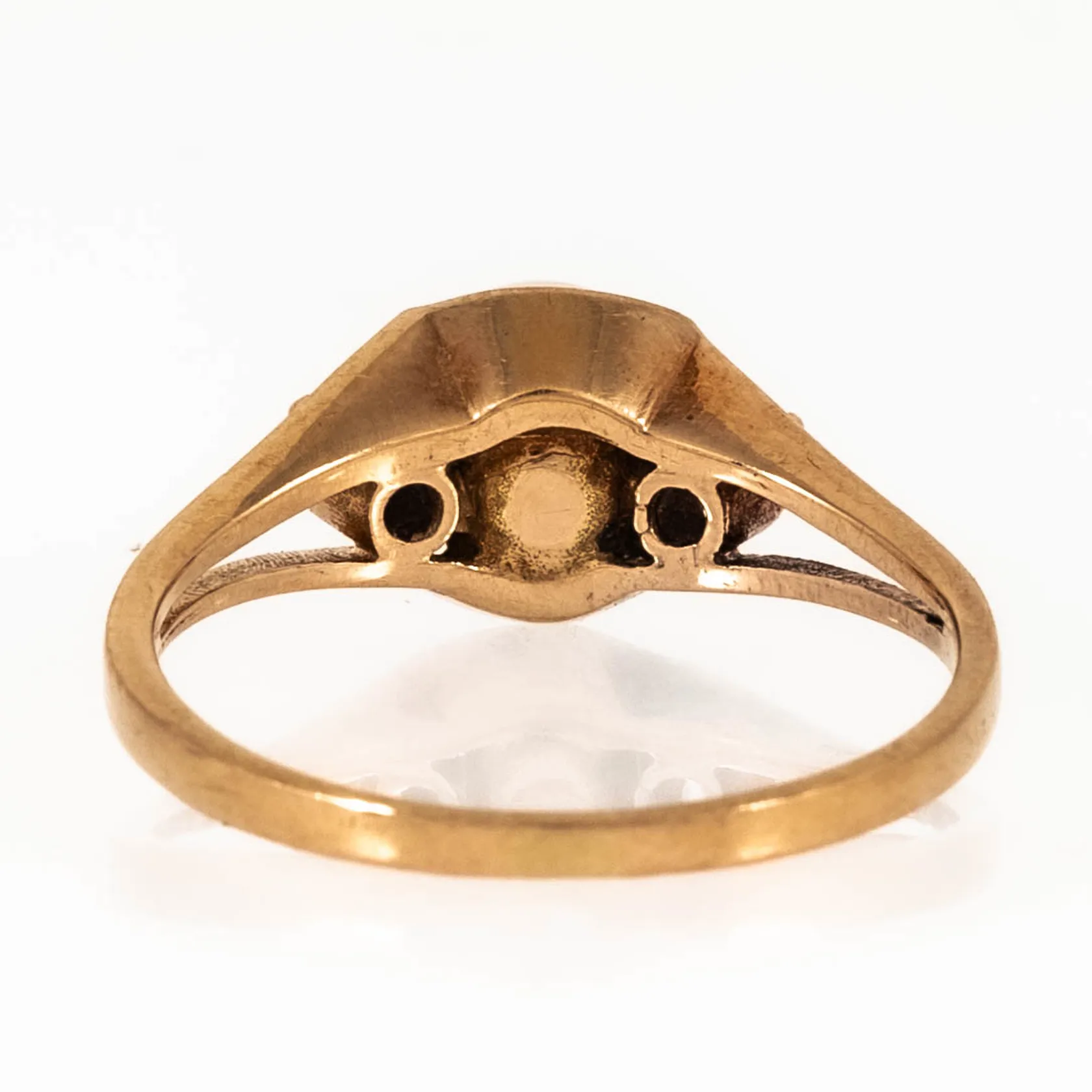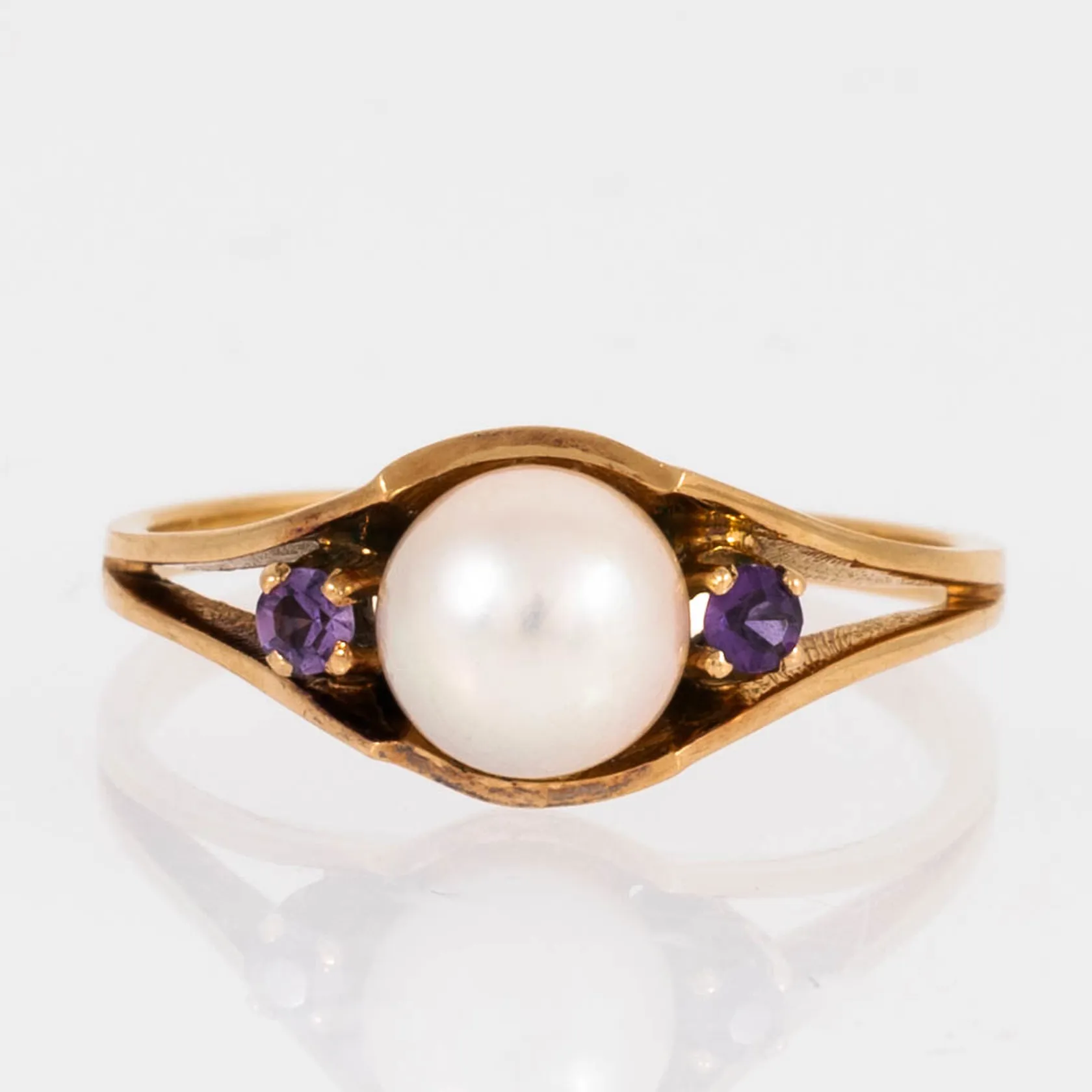 Ring i 18K guld med en saltvattenodlad vit pärla Ø 6,5 mm och två lila stenar Ø 2 mm. Den är i storlek 17¼, är 1,4 - 8 mm bred och väger 3,0g. Svensk importstämpel, 18K, JP. Vikt: 3 g.
