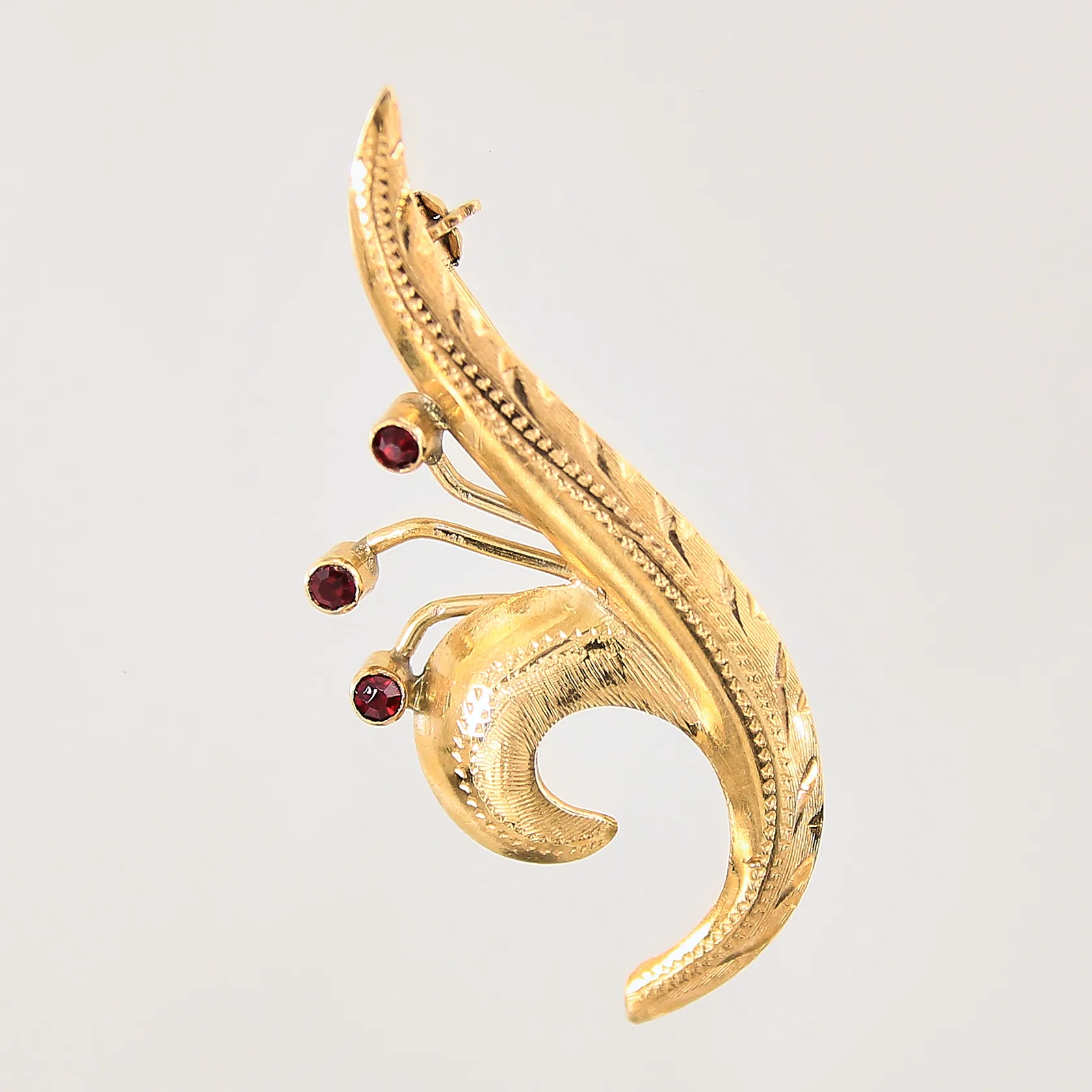 Brosch med röda stenar samt mönstrad dekor, 40x16mm, 18K Vikt: 3,3 g.