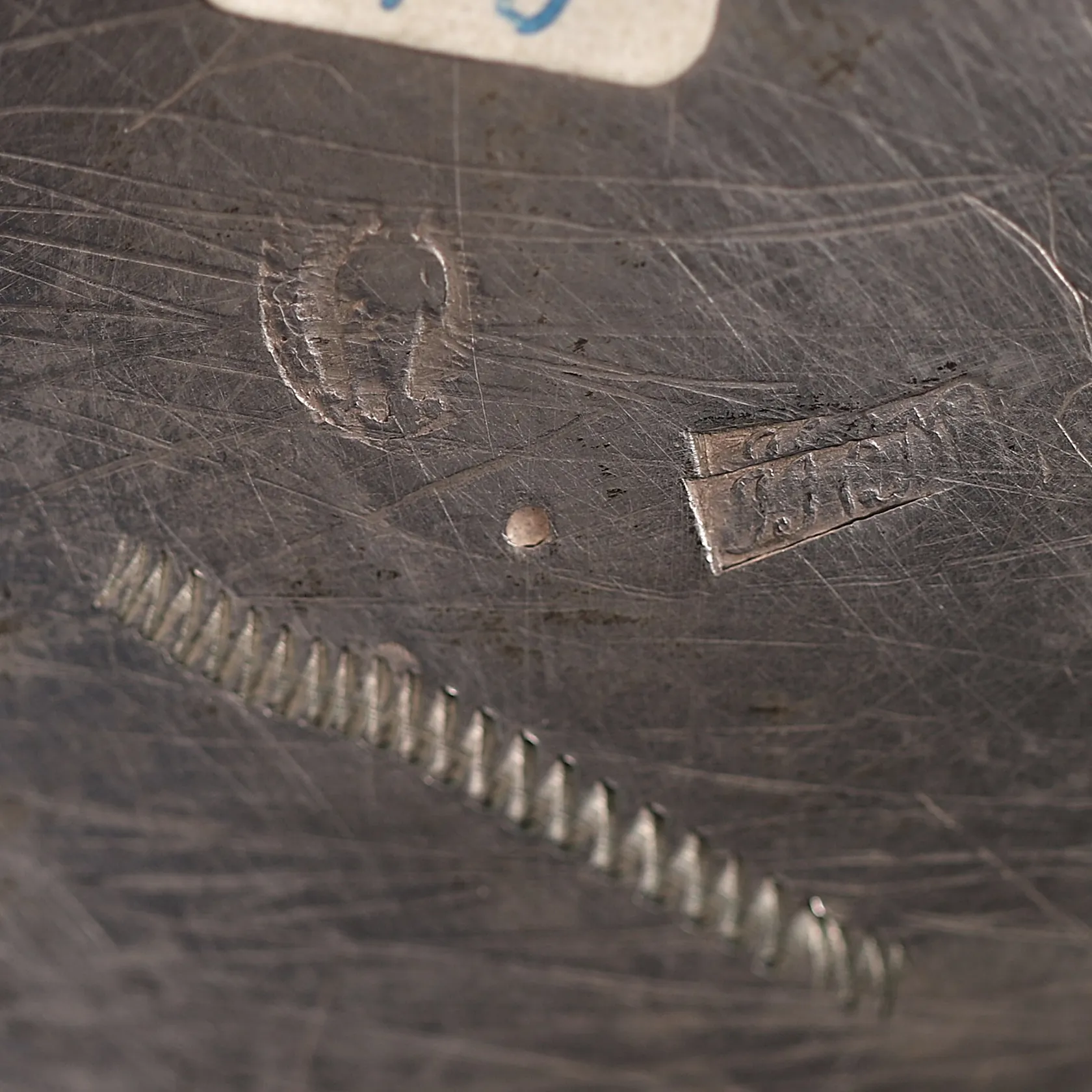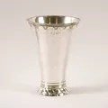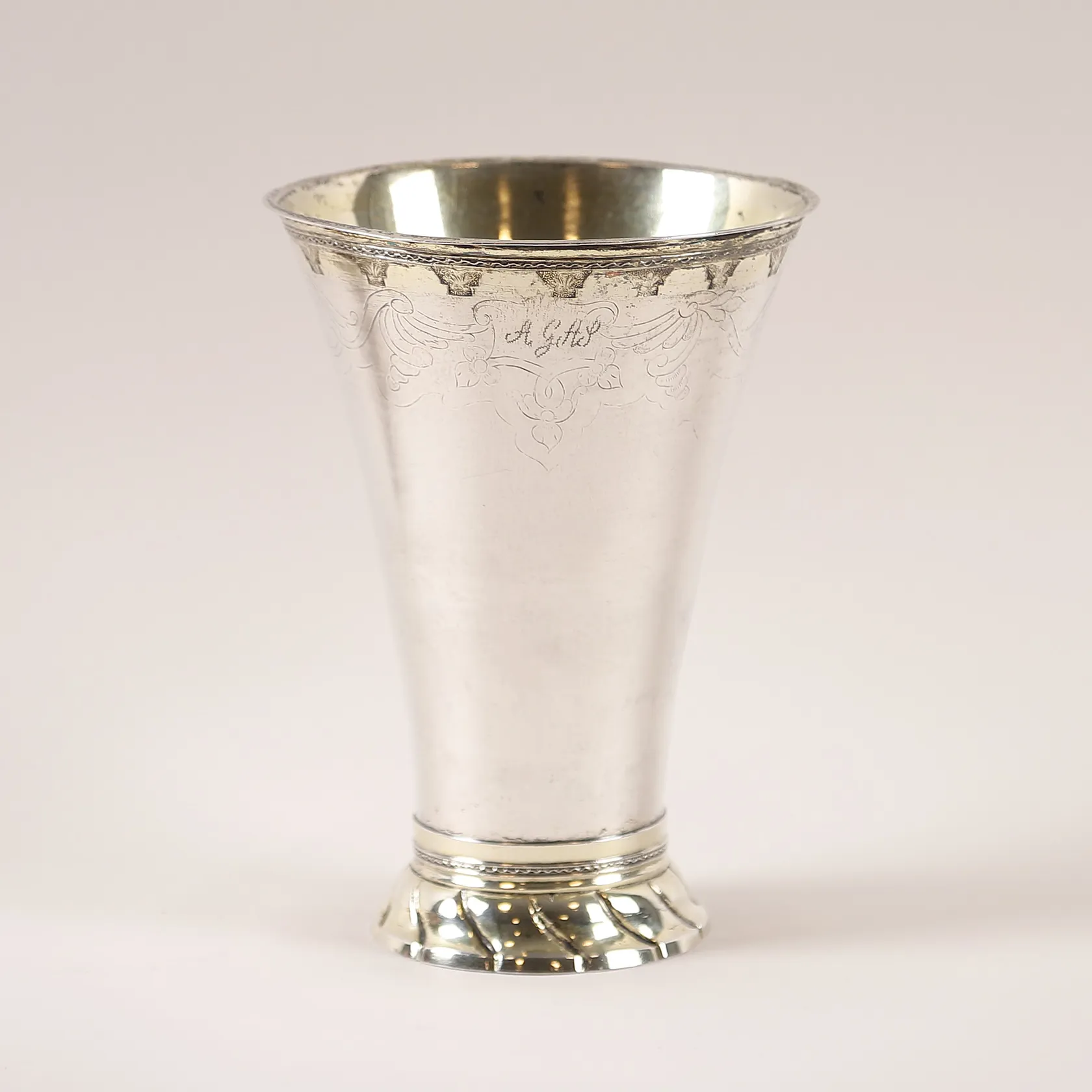 Bägare, rokoko Johan Hedman, Södertälje (1750-1786), dekor av rocailler, stansad lambrekängbård, på klockad fot med vridna knäckar, höjd 18,5 cm, åldersbetingat slitage, äldre gravyr, silver. Vikt: 333,9 g.