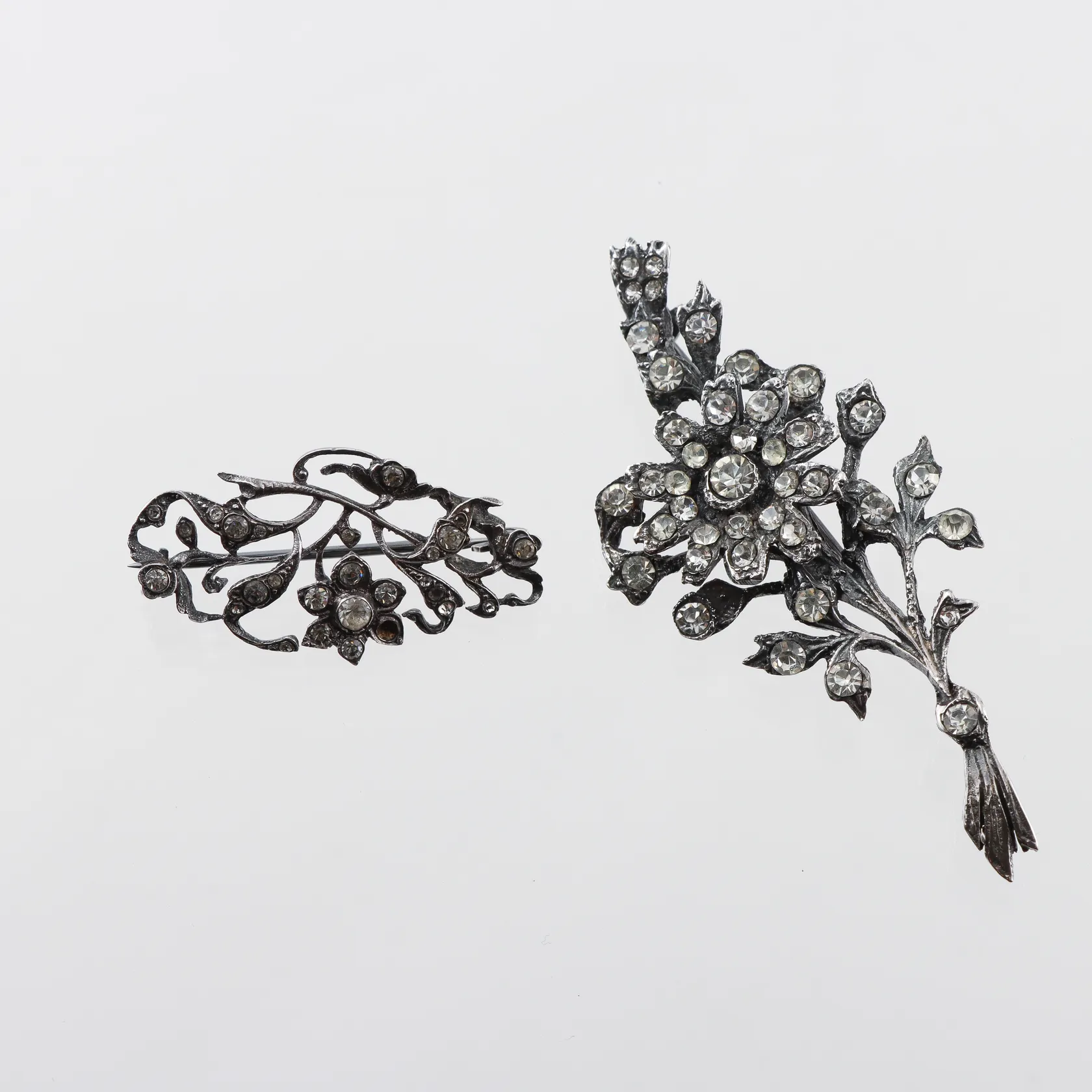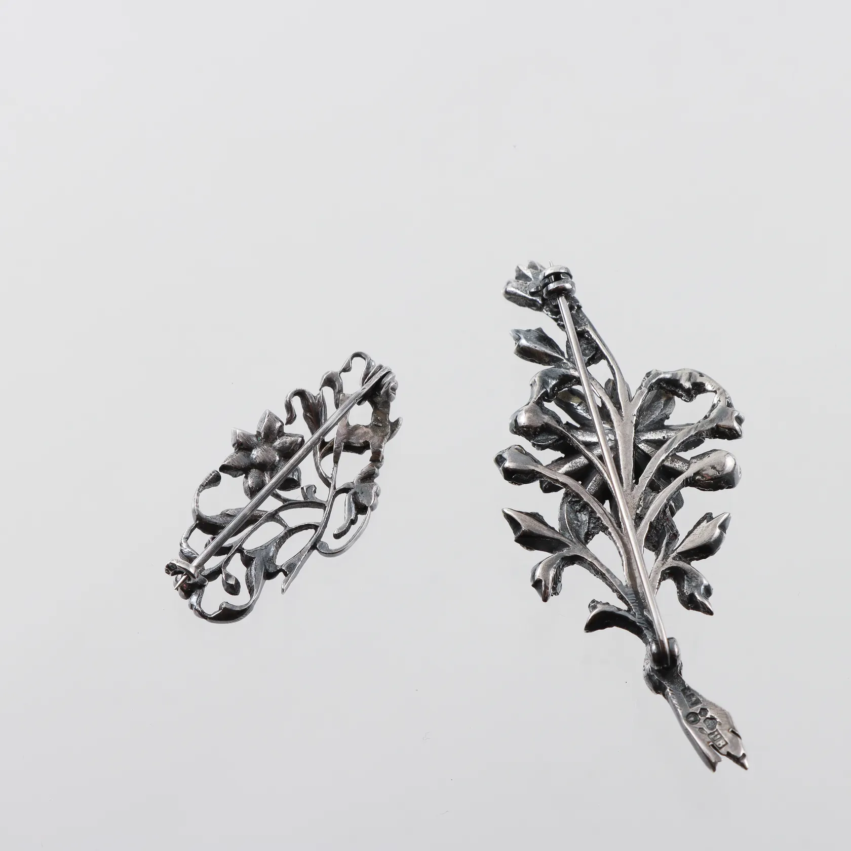 Broscher 2 st med stenar där en saknas, längd ca 4-7 cm,silver. Vikt: 18,5 g.