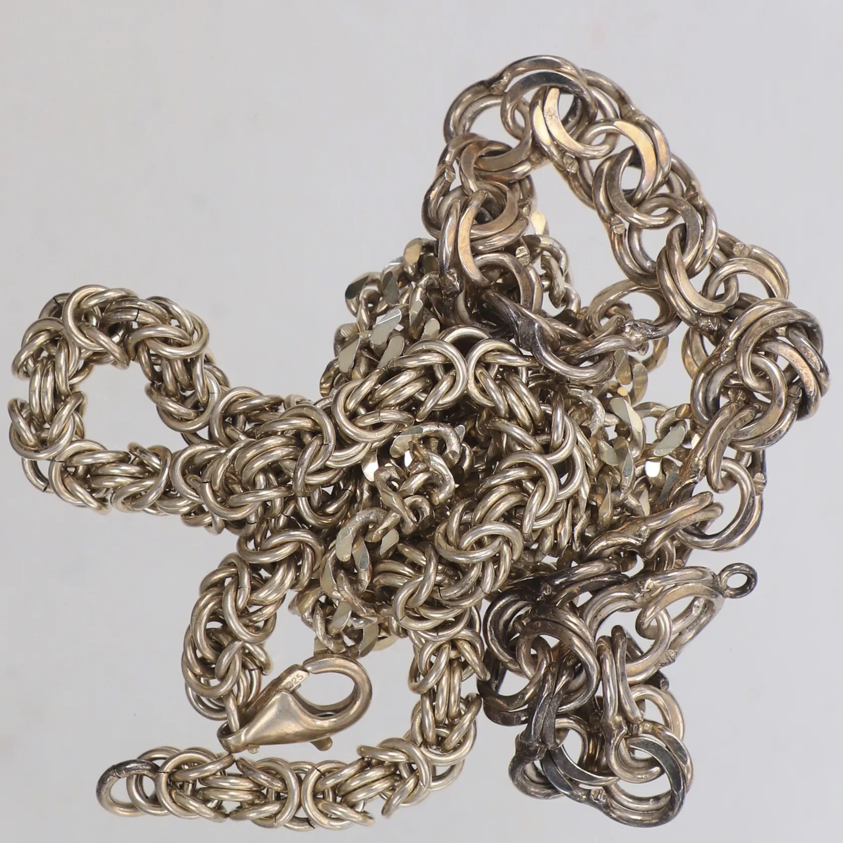 En kedja Pansar, ett armband Bismarck, ett armband Kejsar, defekter, lås saknas, silver 830/1000 Vikt: 52,5 g.