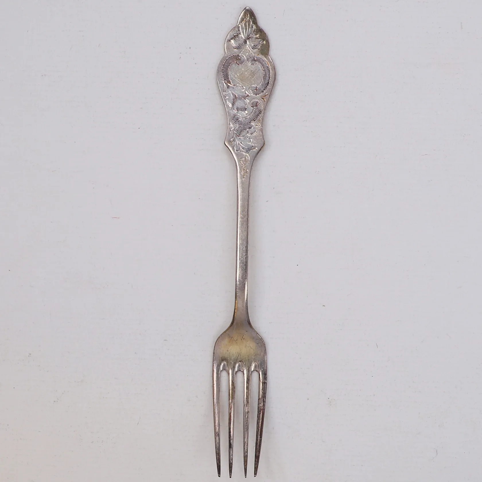 Gaffel, längd 16cm, tyska stämplar, personlig gravyr, 800/1000 silver Vikt: 27,4 g.