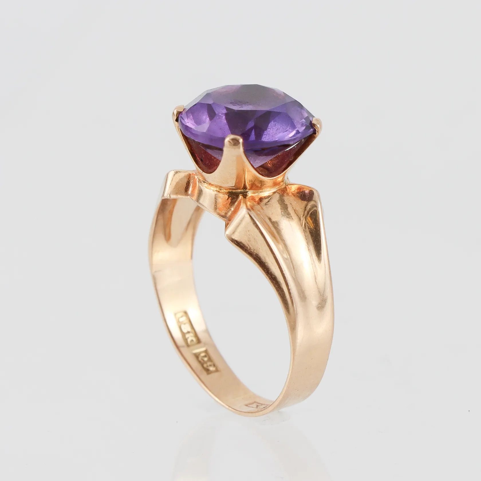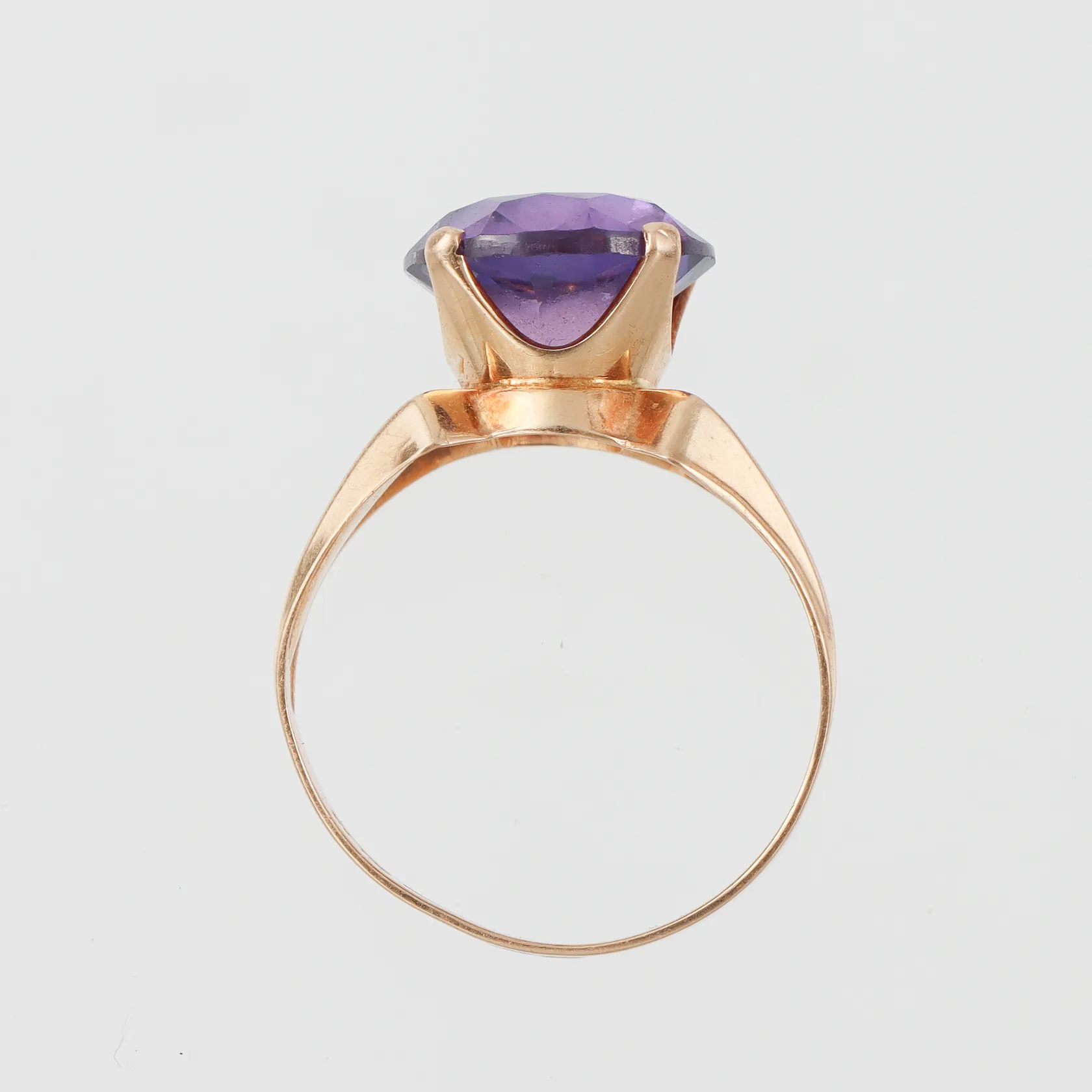 Ring med lila sten, K&EC Göteborg, något ojämn form, storlek 16 mm, bredd 2.9-9.9 mm, 18k. Vikt: 3,1 g.