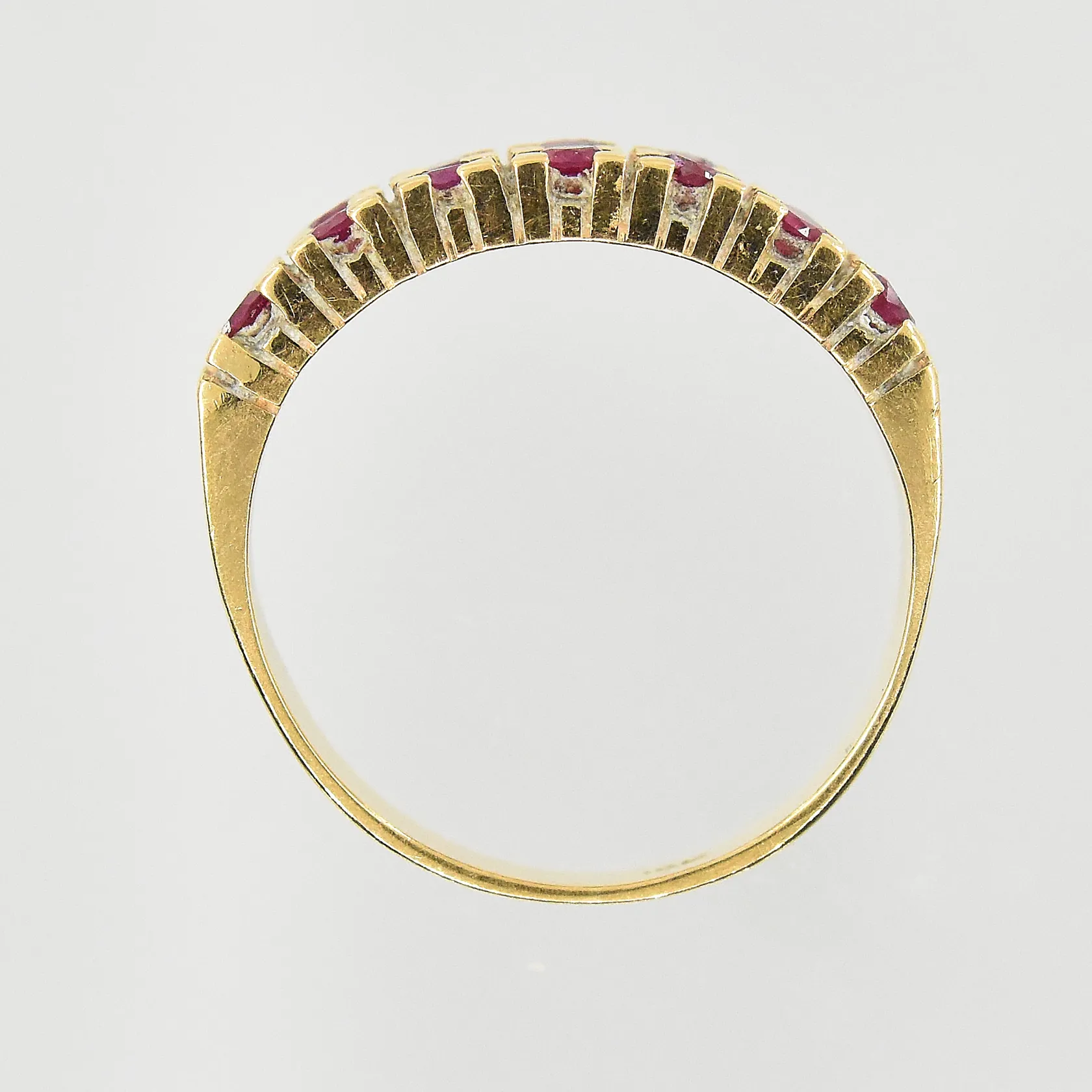 Ring med röda stenar, stl 16¼, bredd 3-6 mm, 18K. Vikt: 4,3 g.