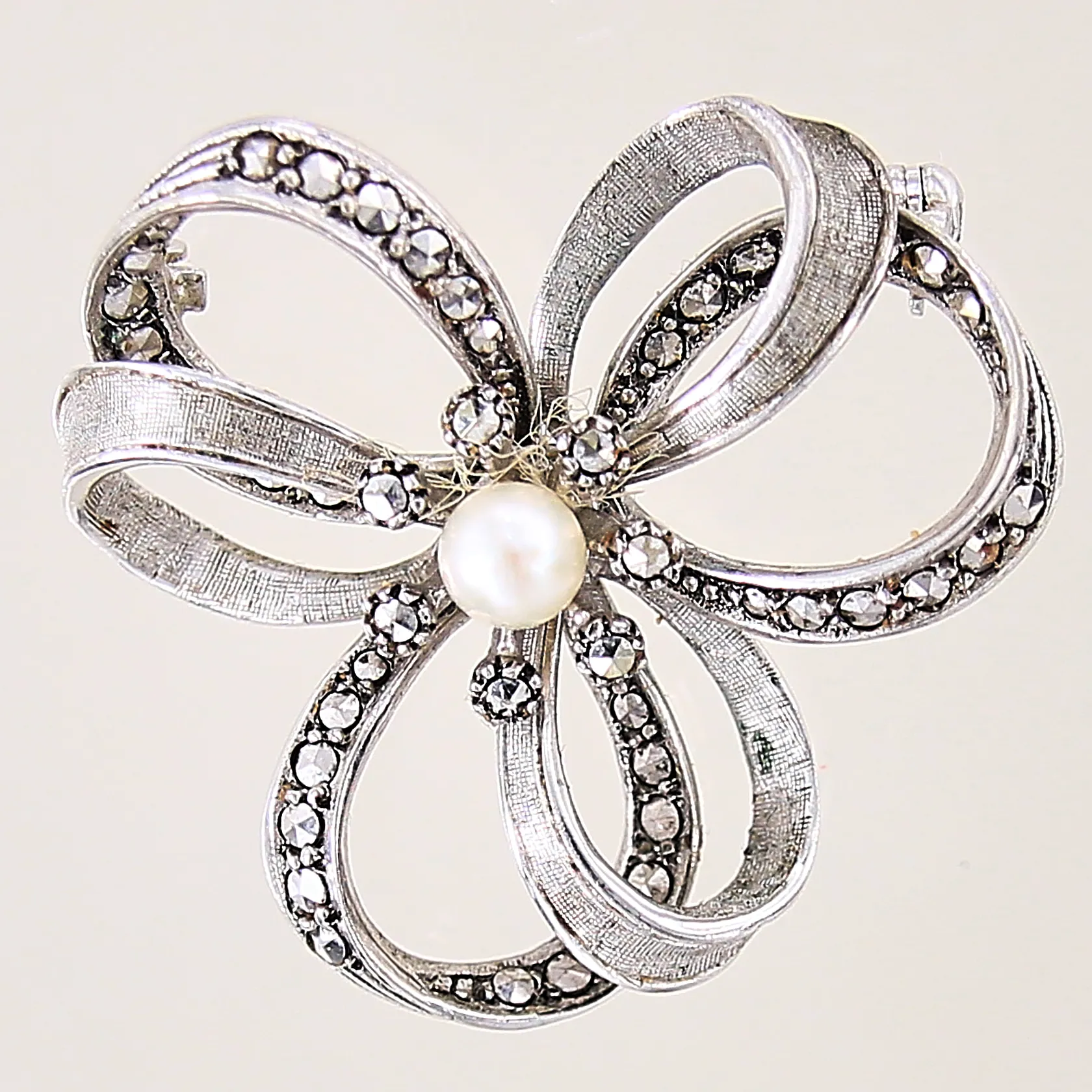 Brosch med markasiter samt odlad pärla, Ø36mm, nål saknas/defekt, silver 835/1000 Vikt: 9,9 g.