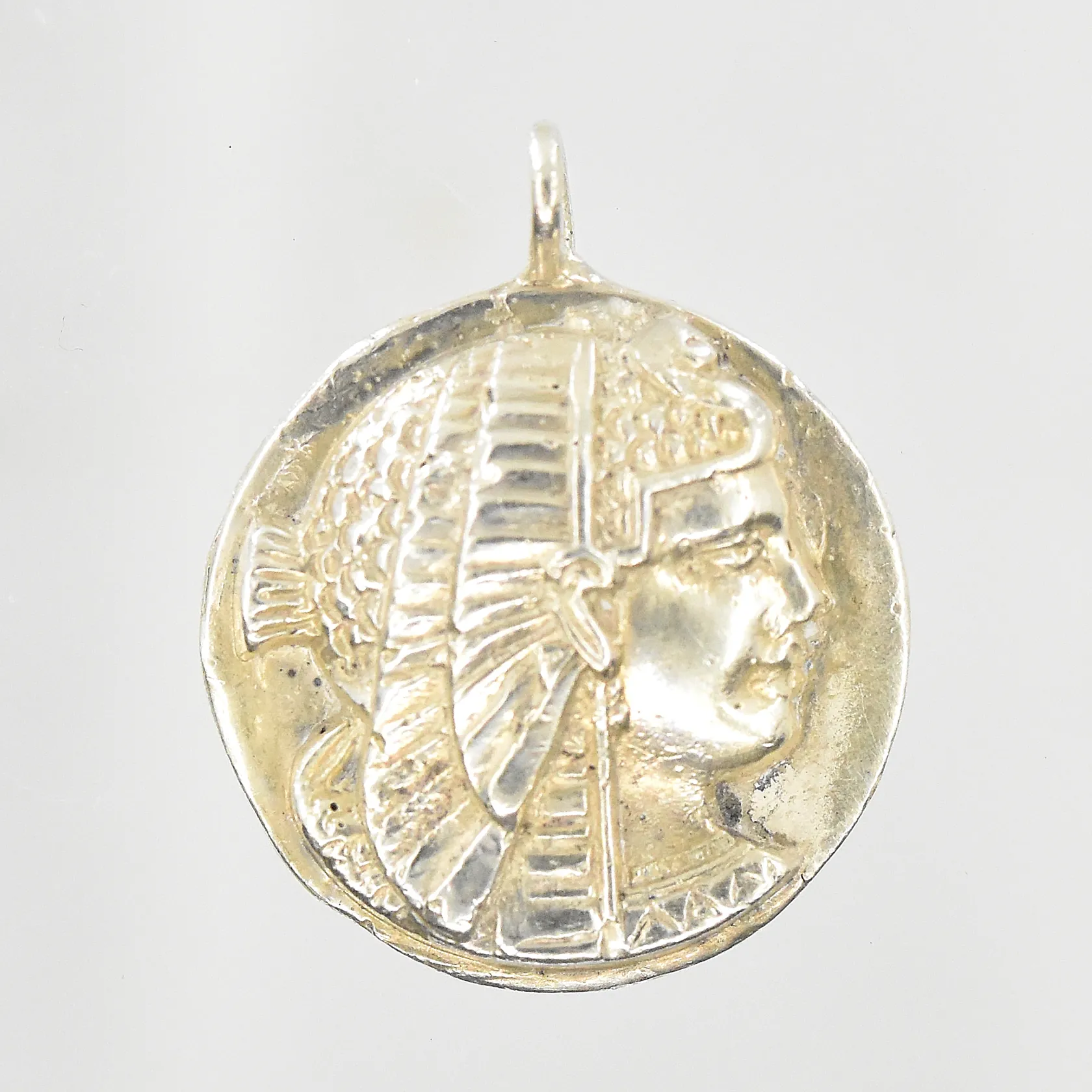 Hänge Egyptiskt motiv, längd 27 mm, Ø22 mm, borrhål på baksida, 835/1000 silver. Vikt: 13,7 g.
