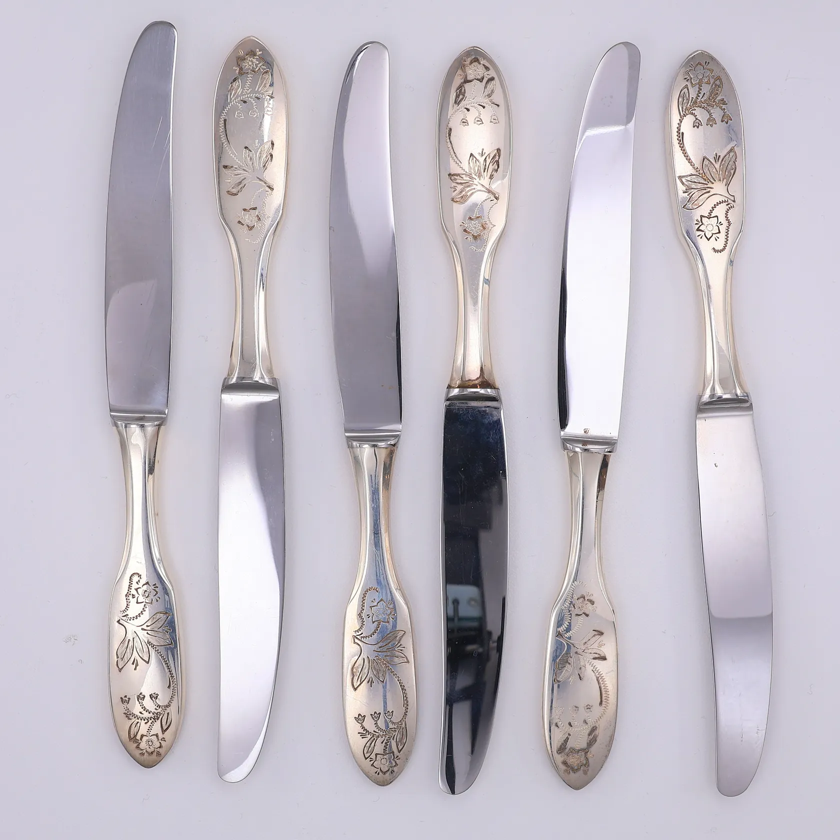 6 Bordsknivar, modell Tornedal, knivblad i stål, 20,3cm, Mema år 1975-79, 830/1000 silver Vikt: 263,1 g.