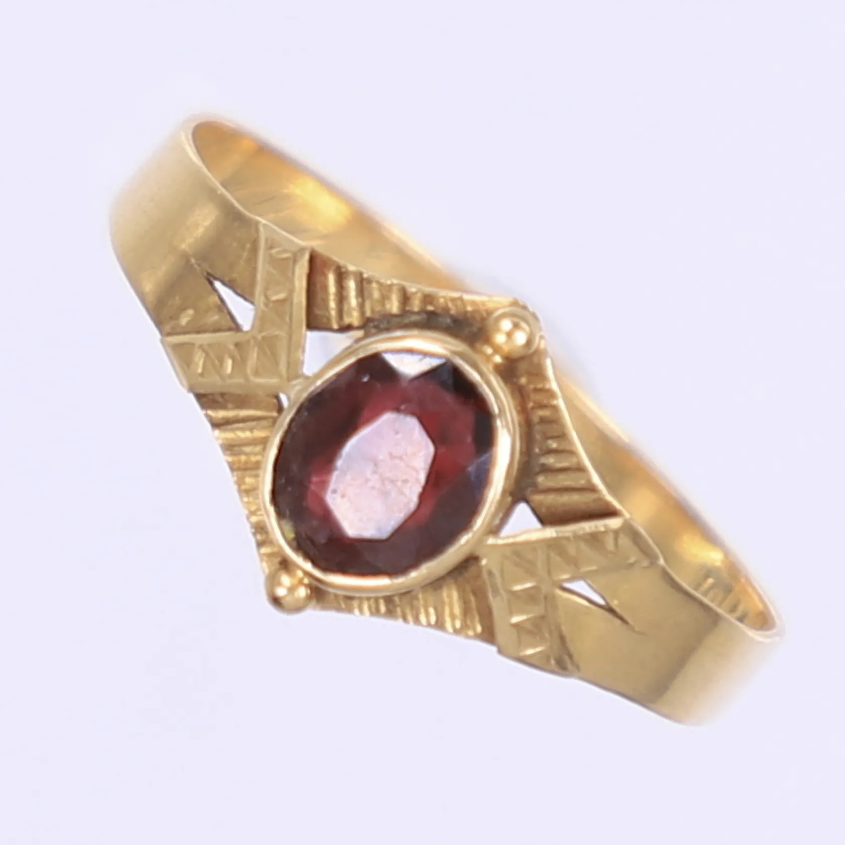 Ring med röd sten stl 17¼ bredd 3-9mm, gravyr, något ojämn skena, 18K Vikt: 1,2 g.