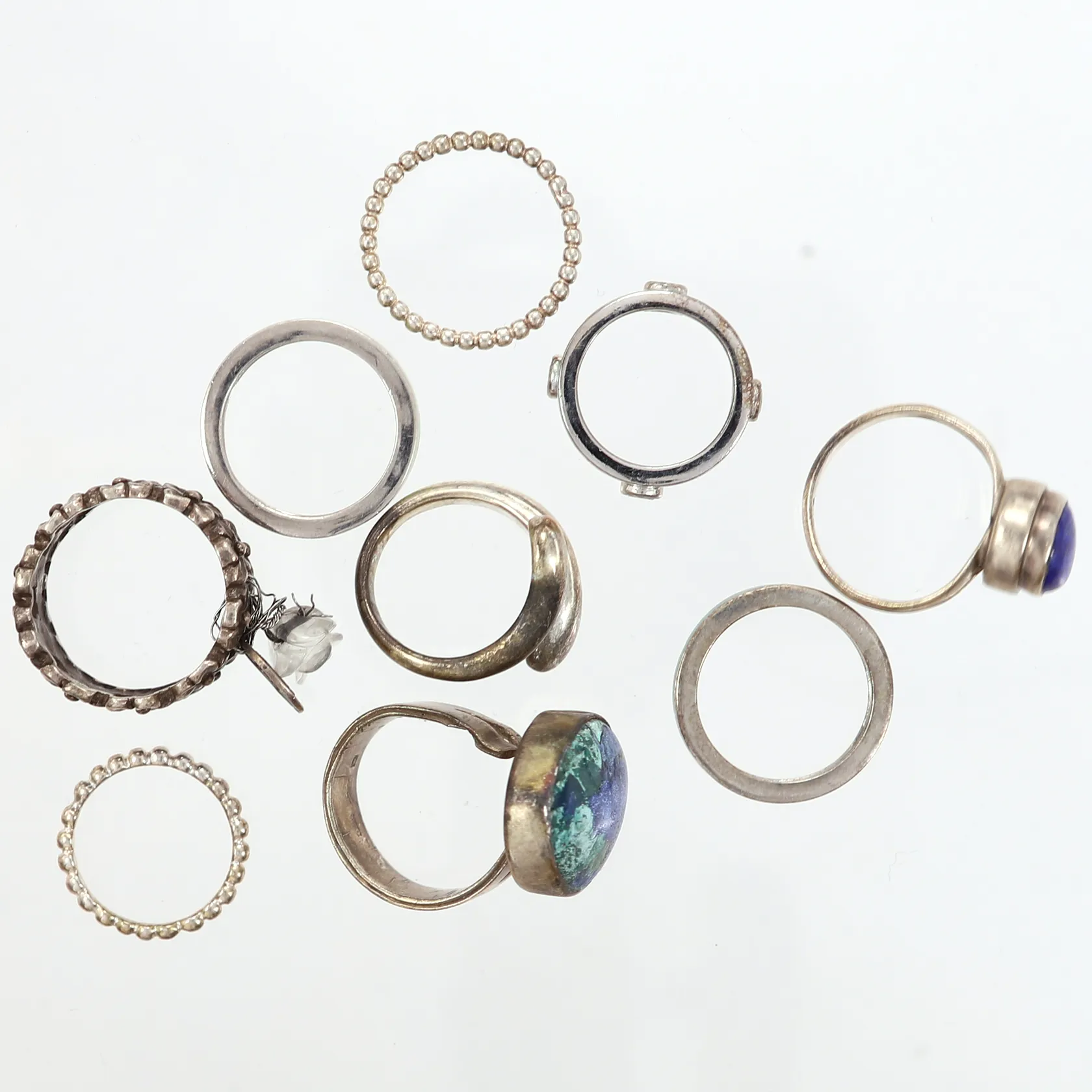 Tio ringar i olika utföranden stl 16-18, silver 925/1000 Vikt: 48,5 g.