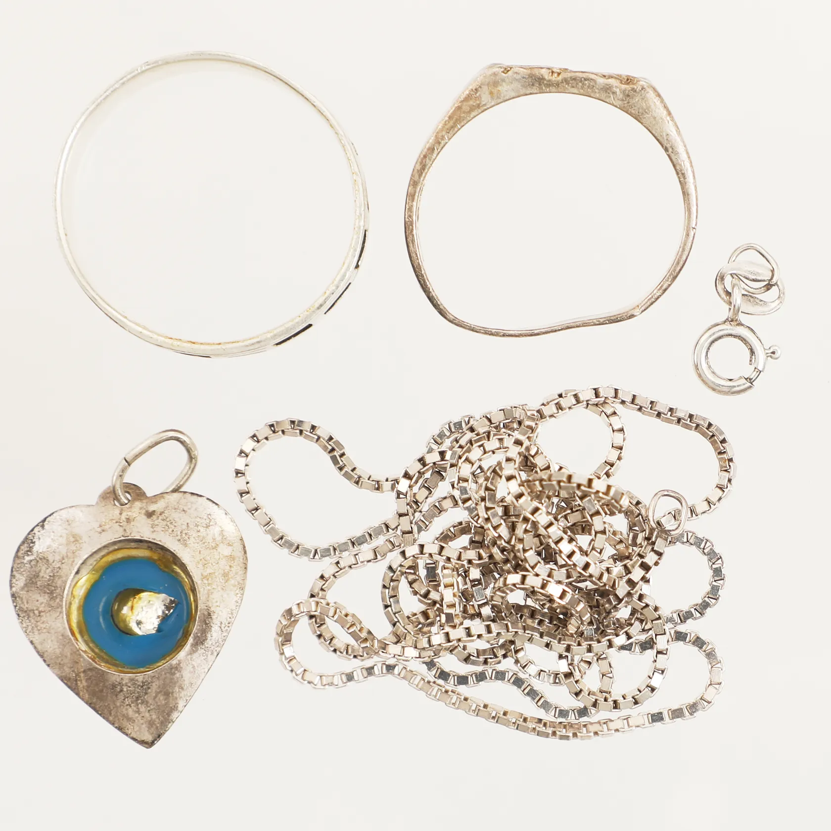 Diverse silver, defekt, silver Vikt: 16,9 g.