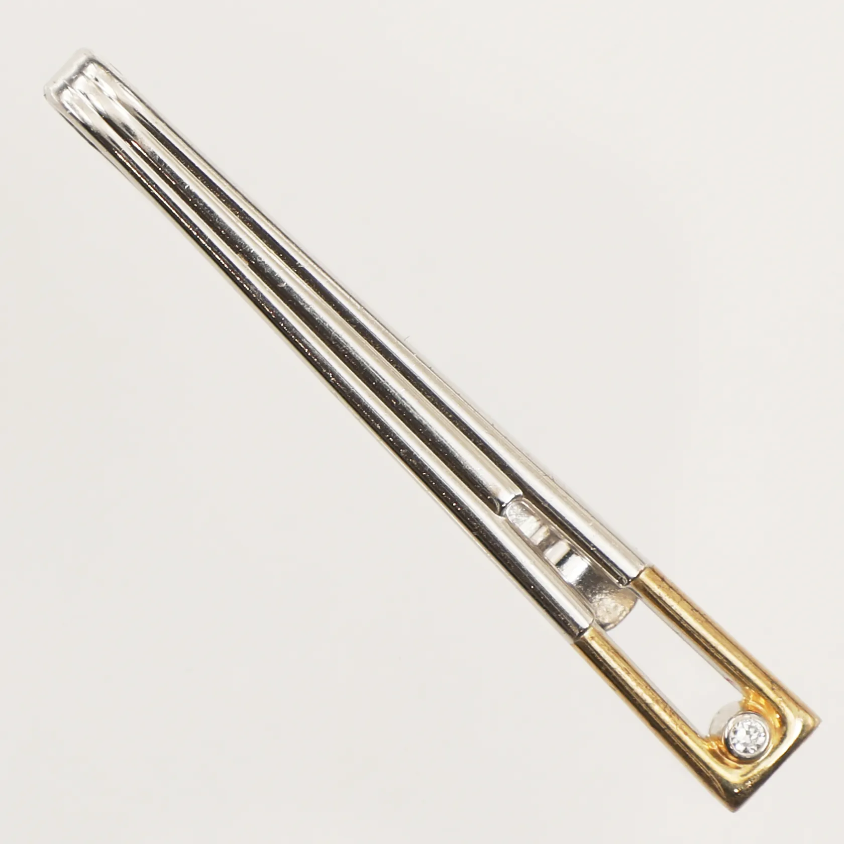 Slipsklämma med vit sten, längd 7,4mm, bredd 57mm, förgylld detalj, 925/1000 silver Vikt: 6,1 g.